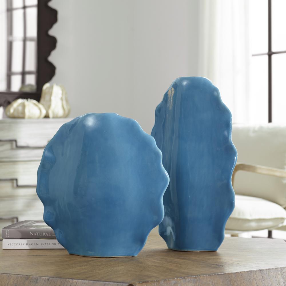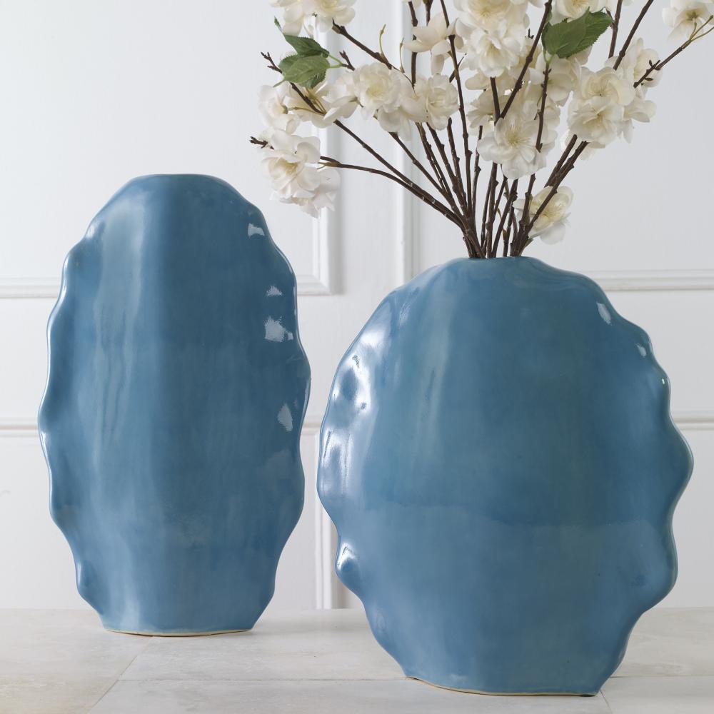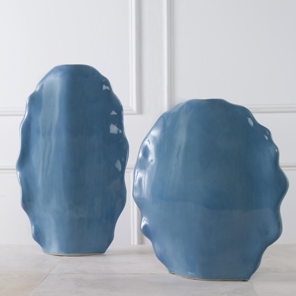 Set of two ceramic vases model organic curved edges that create an artistic look and are finished in a striking gloss blue glaze. May be used outdoors, but protection from freezing temperatures is recommended. Sizes: S-16x16x5, L-12x20x5.