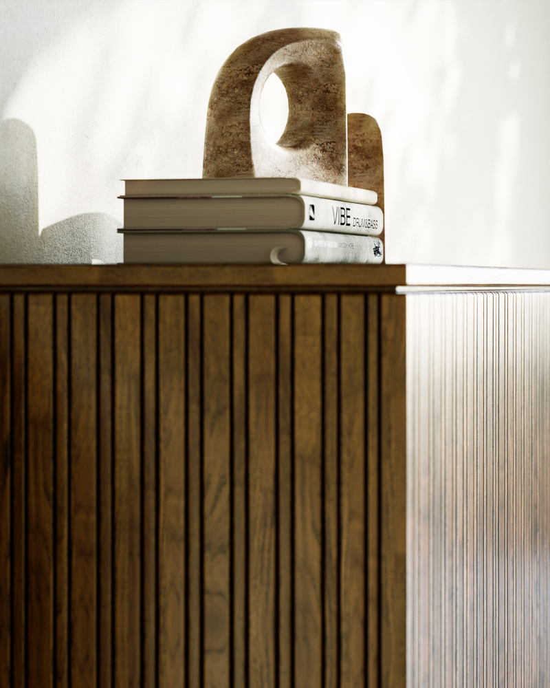 The Russo Travertine Object Set is made of titanium travertine; the surfaces of the sculptural pieces swirling with a more dynamic pattern than some travertine stones do. These brown sculptures were designed so they can also stand in for bookends. The pitting and veining on these objects will vary from piece to piece, given they are made of natural stone.