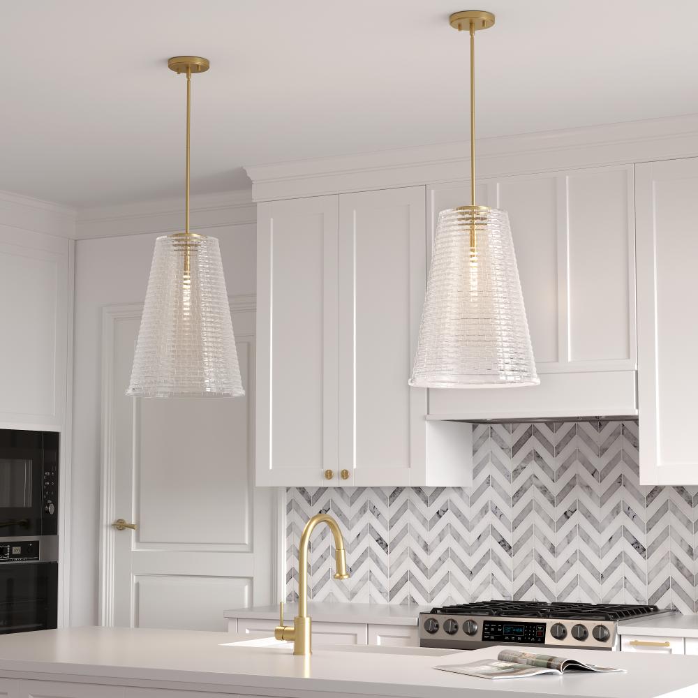 The Saben Collection of vanity and pendant lighting is pure glamour, perfect for any interior scheme from transitional modern to Art Deco. The basket-weave textured, clear glass shades create a crystal-like effect against the sleek, understated lines of the elegant fixtures, which are available in matte black, modern gold, polished nickel, brushed nickel or vintage brass. The overall result is a playful and sparking display of light.