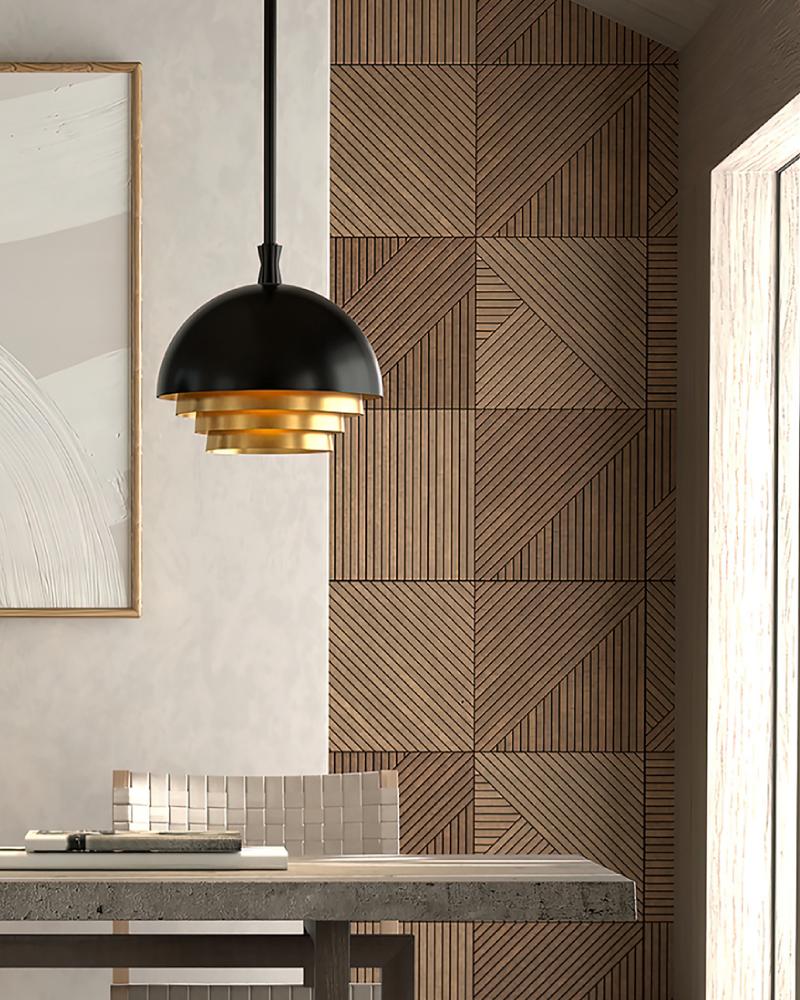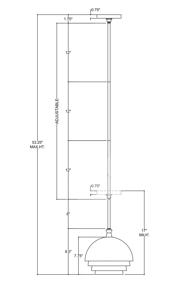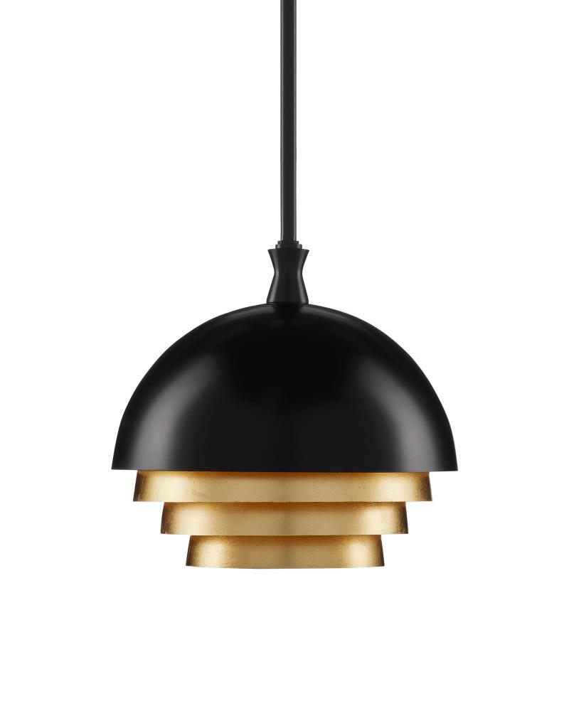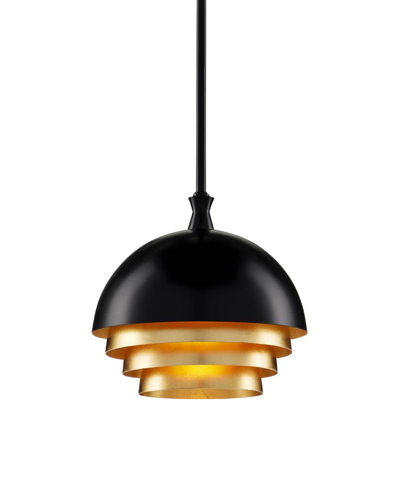 The cascading forms that make up the shade of the Salviati Pendant are fashioned from steel in a contrasting mix of deep black and luminous gold leaf. Telescoping rings are inserted into the larger dome in a way that allows the illumination to reflect on each of the gold surfaces for an enhanced glow. The simplicity of the stem and hardware from which it hangs heightens the contemporary feel of this black pendant. Adjustable from 18" to 54" with use of included chain/rod kit/cable. If your space calls for a longer drop, additional chain/rods/cable is available for purchase.
