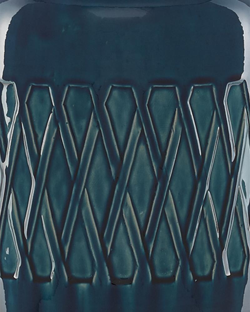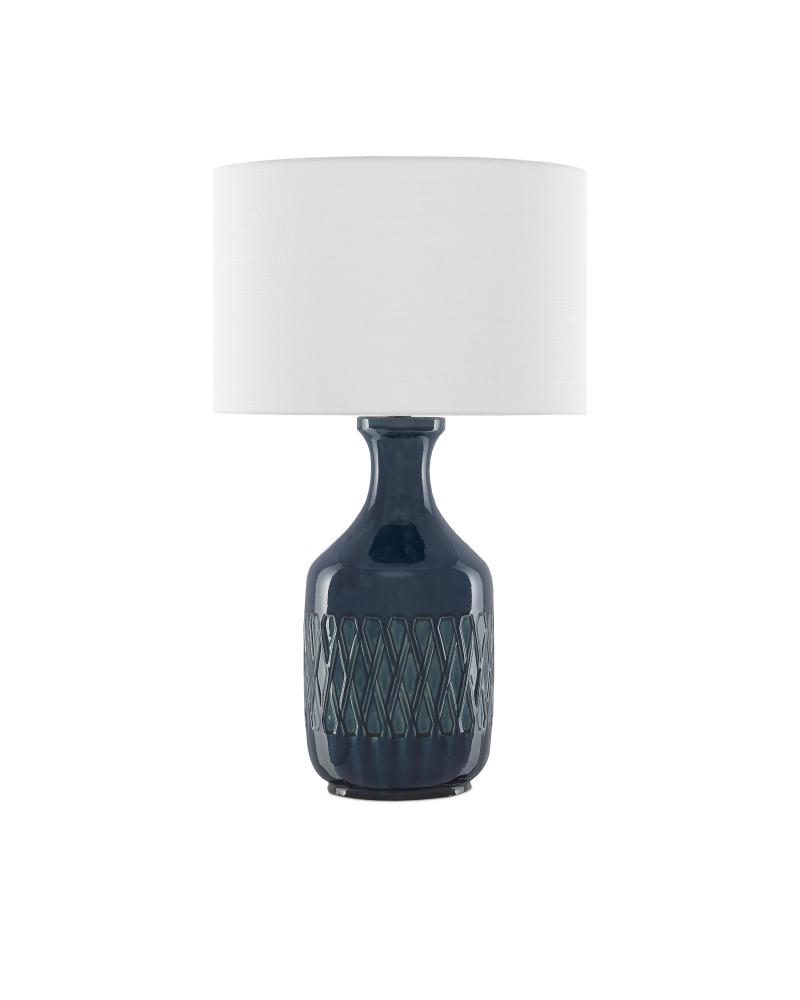 Our Samba Blue Table Lamp is luminous with its ocean blue reactive glaze covering the ceramic surface of the vase-shaped body. The pattern that has been carved into the ceramic at the lamp's widest point absorbed the glaze differently to create contrast. The off-white shantung shade is fastened to the blue lamp by a matching finial.