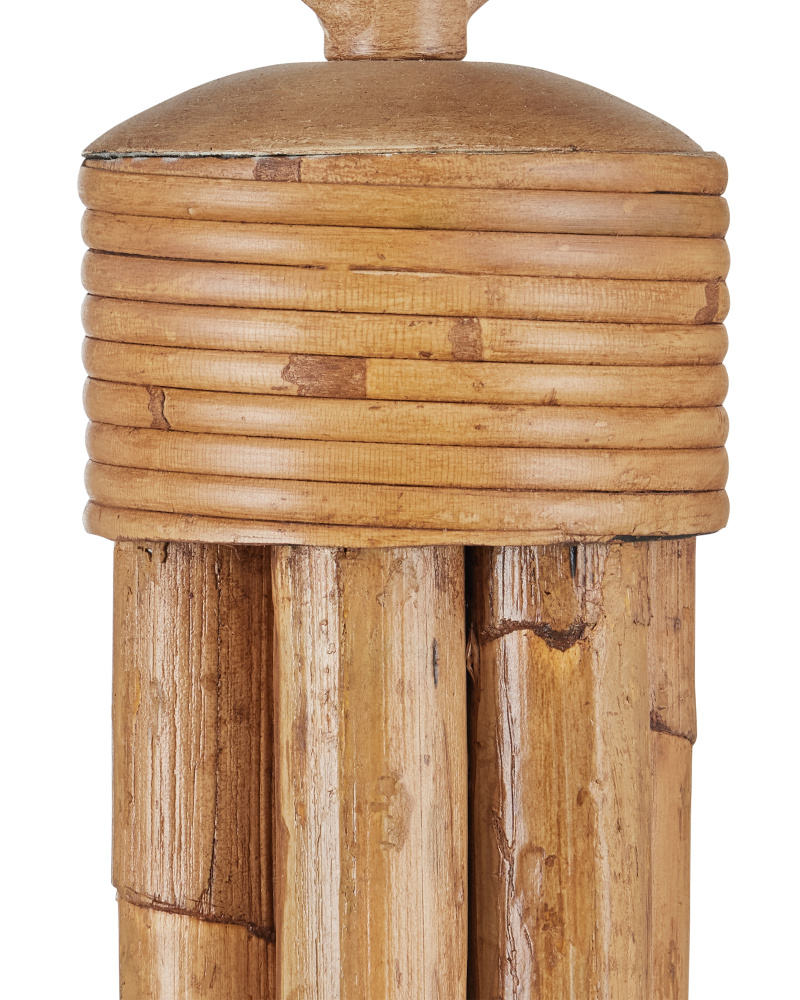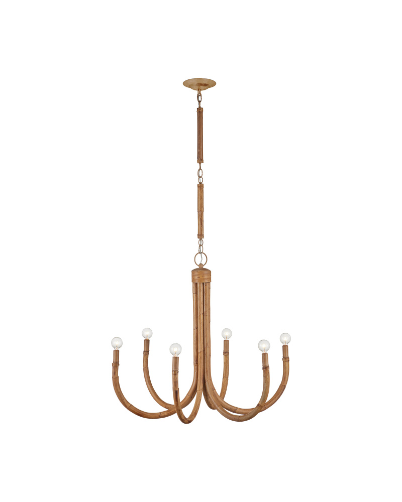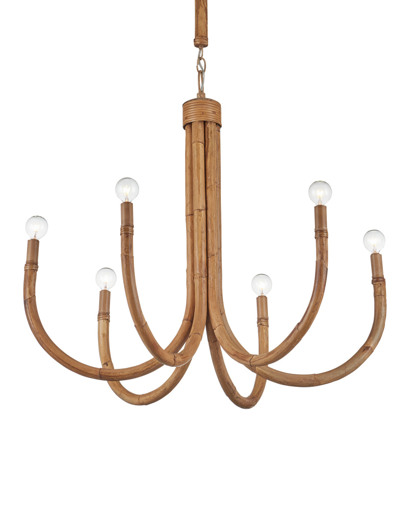 The Samsara Small Chandelier is made from thick reeds of rattan that bend to curve up and hold its six lights, which takes great skill and effort with rattan this sturdy. To keep the aesthetics of the natural tan chandelier clean, the candle sleeves and hardware all but disappear in a saddle tan finish. The thinner reeds that hold these in place are also tonally complementary. Adjustable from 35" to 115.5" with use of included chain/rod kit/cable. If your space calls for a longer drop, additional chain/rods/cable is available for purchase.