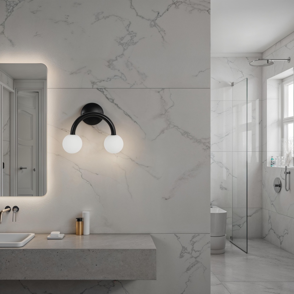 A stylish choice for contemporary interiors, this double-light wall sconce will bring a whimsical touch to your project. Its two white etched globes are suspended from a matte black-finished iron fixture, delivering an airy aesthetic and modern vibe anywhere you feature it. Perfect for pairing up or showcasing solo.