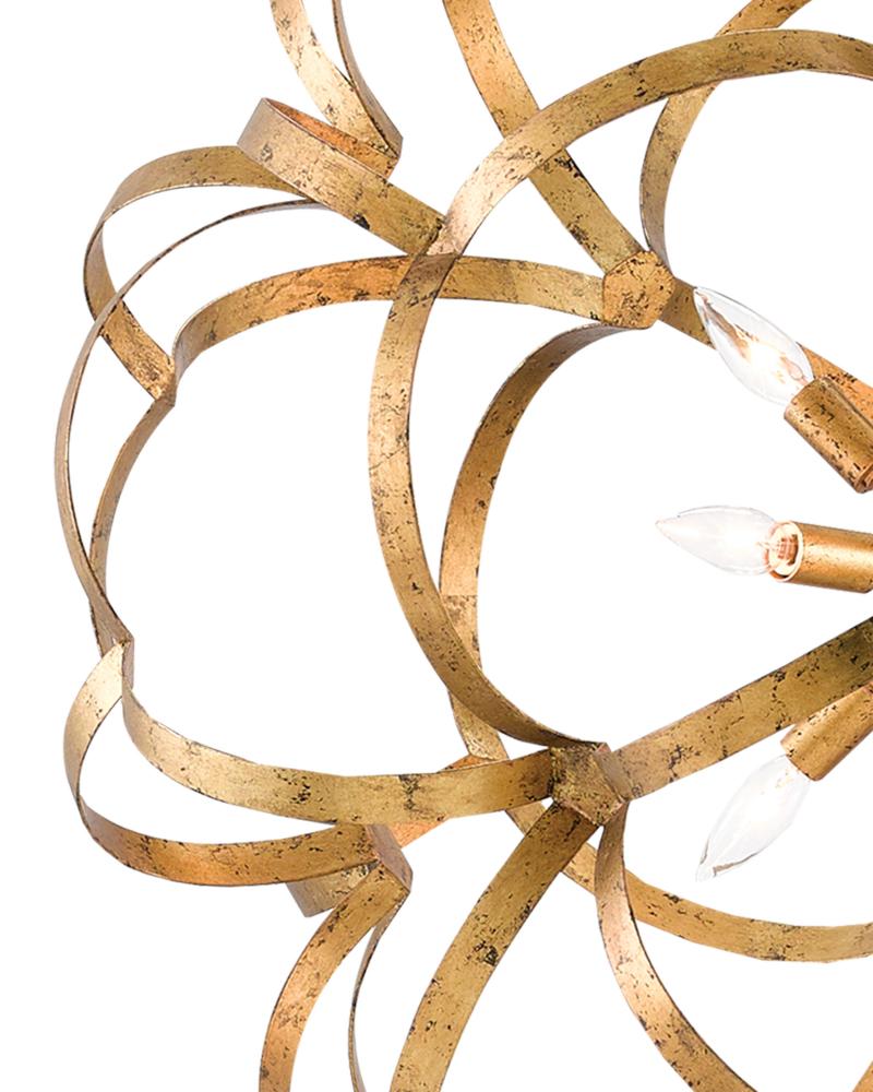 As lyrical in style as the poetry written by the namesake of our Sappho Orb Chandelier, this fixture is a veritable festival of winsomeness. The ribbons of wrought iron seem to be fluttering around the nine lights, which proves the talent of our craftspeople who can take such a rigid material and make it feel graceful. The finish artisans then covered the composition in a new gold leaf, which gives the fixture a gleaming hint of patina.