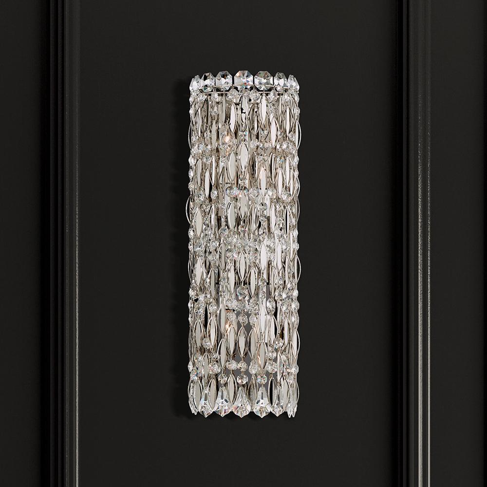 A waterfall of metal discs and crystal beading glimmers around fine glass arms. Sarellaā„¢s classic marriage of hand-finished metal and multifaceted crystal drops sheds a beautiful, soft light on your interior. An instant heirloom, it has been interpreted in different styles, from the traditional frame enhanced by round branches, to the simple bejeweled columns perfect for intimate areas.