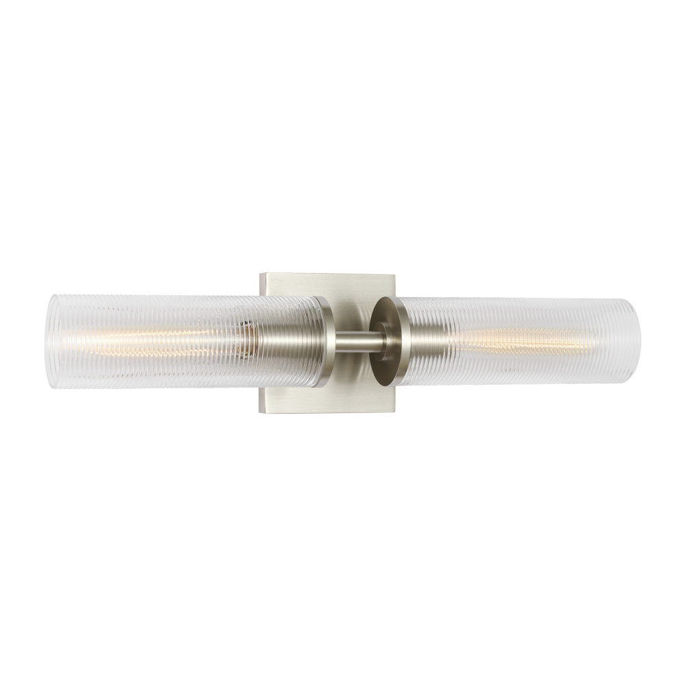 Crafted with Steel in a Brushed Nickel finish with clear ribbed glass shades