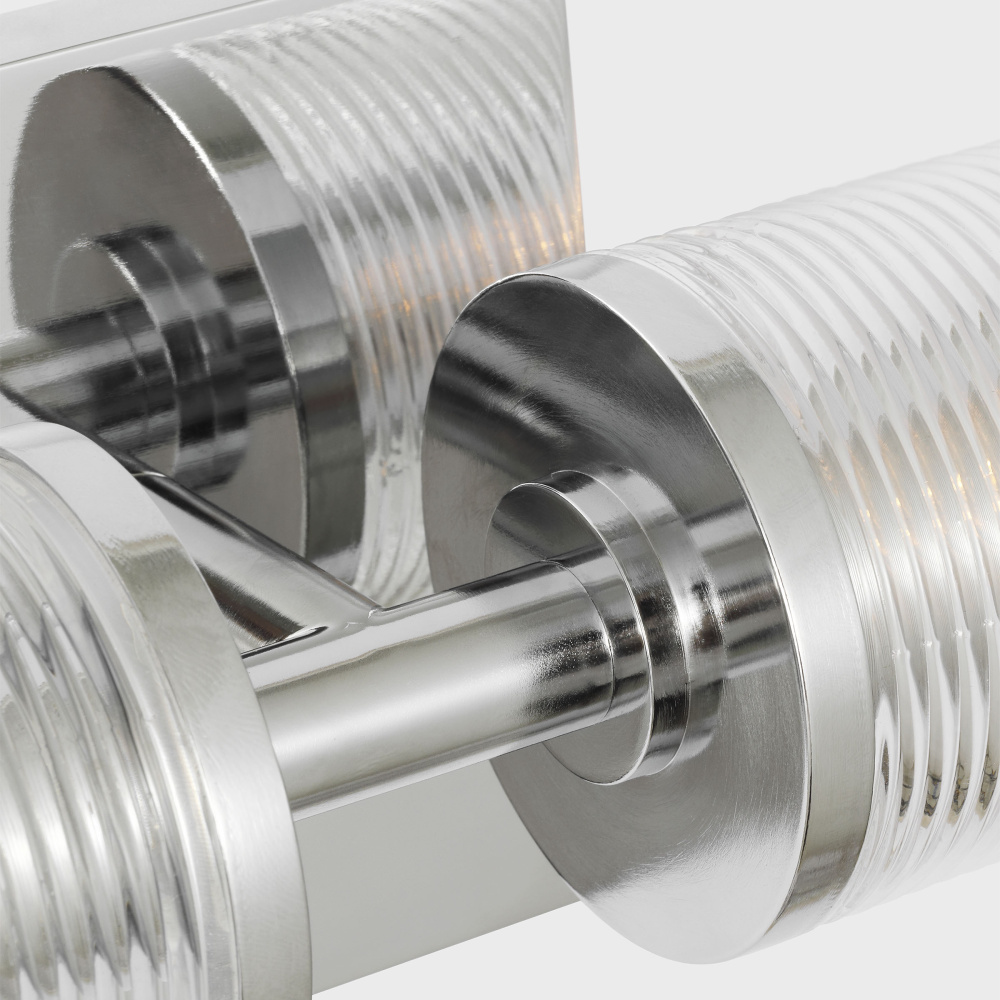 Modern aesthetic meets textural detail in the Sarita sconce by Drew & Jonathan. Ribbed glass completes the streamlined cylindrical forms while diffusing light and elegantly contrasting the bold square backplate. This sophisticated sconce will lend a subtle industrial accent and is ideal for bathrooms.