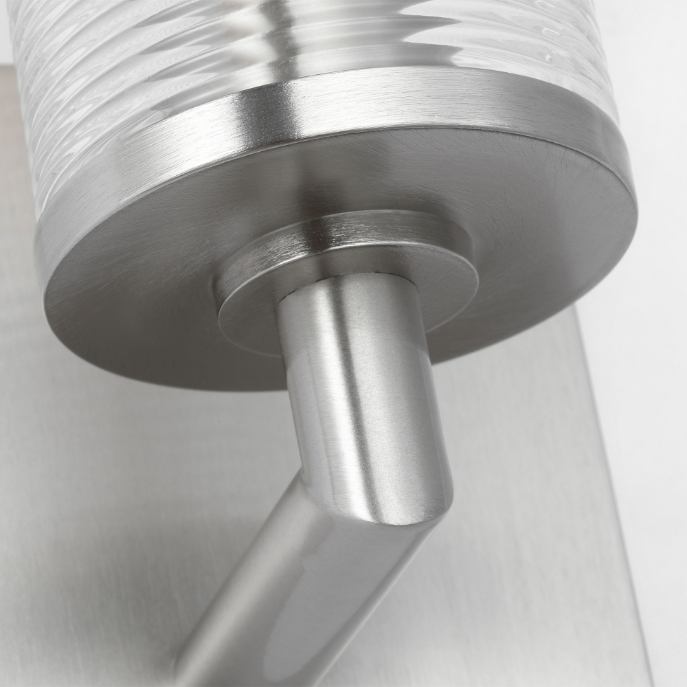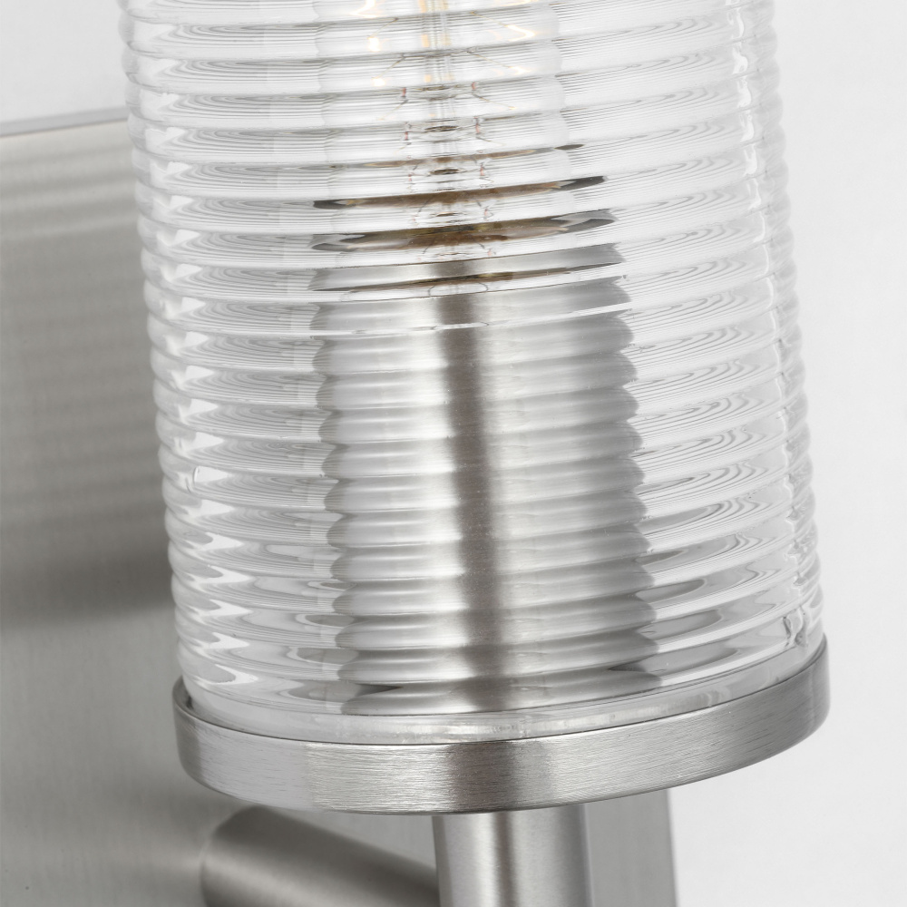 Crafted with Steel in a Brushed Nickel finish with clear ribbed glass shade