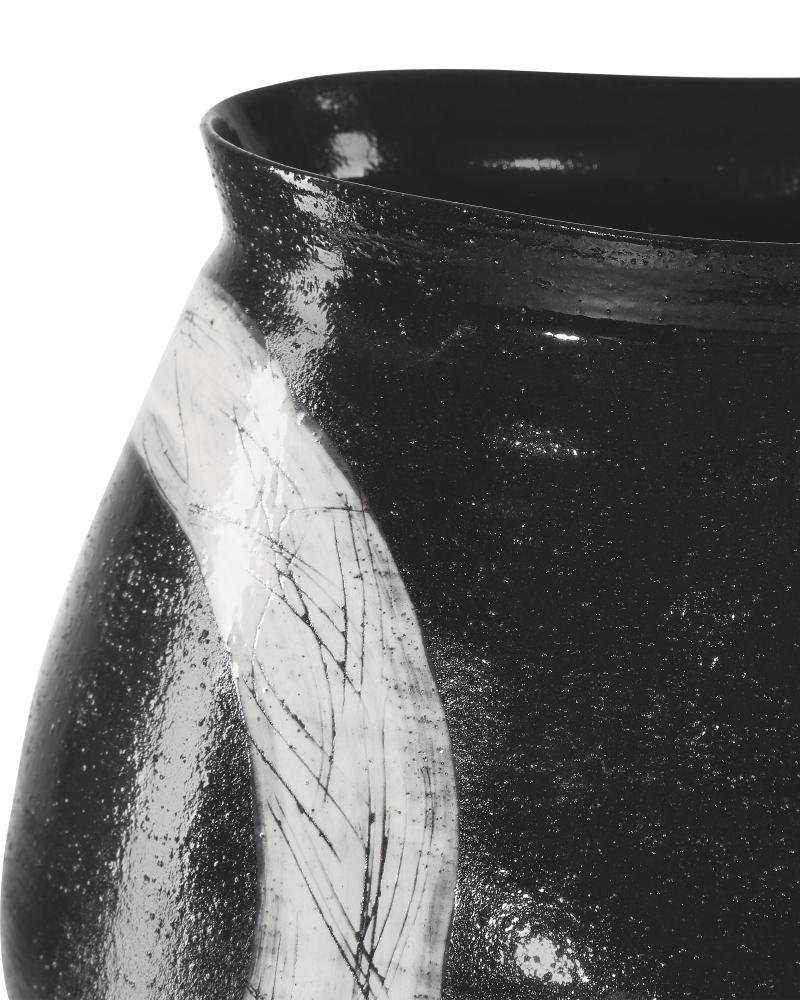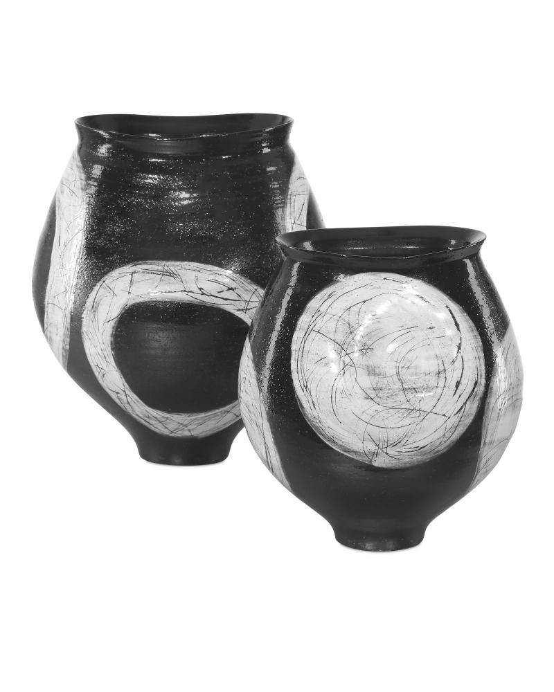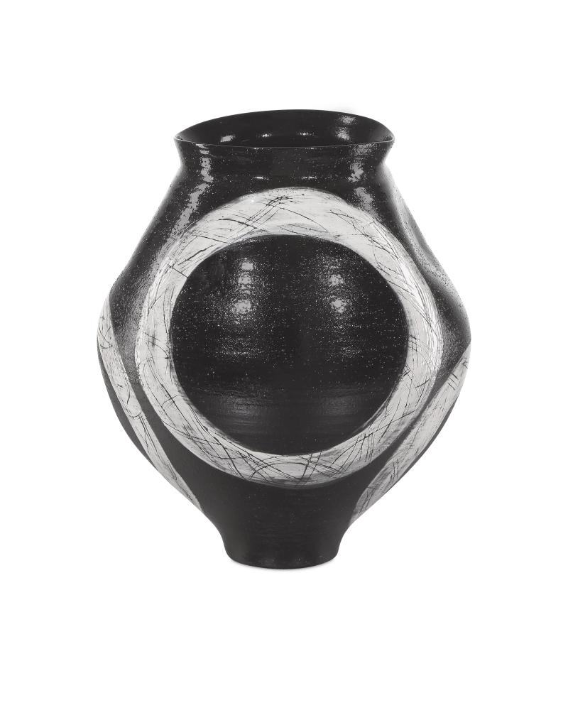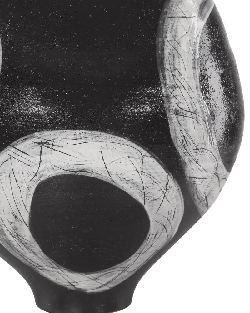 The Satori Vase is an artisanal creation made of porcelain that is hand-thrown, hand-glazed, and hand-decorated. The pale gray and black vessel has intentional pitting on the surface. Because the motifs on this vase are created by hand, each will vary slightly as each artist puts his brush to the surface of the glazed material in his or her own unique way. A design detail worth noting is how the vase sits on a smaller rounded bottom, while the irregular oval top reflects the swell of the vessel's shape.