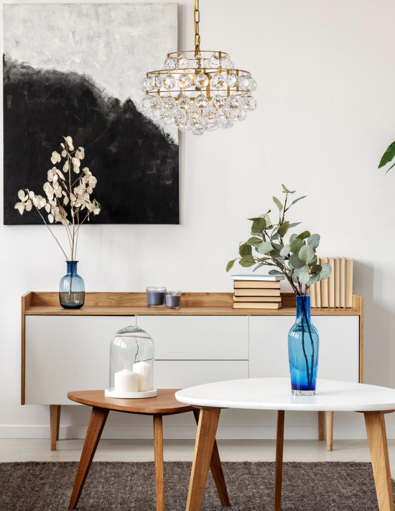Tiers of clear multi-faceted crystals reflect the soft glow of candelabra bulbs