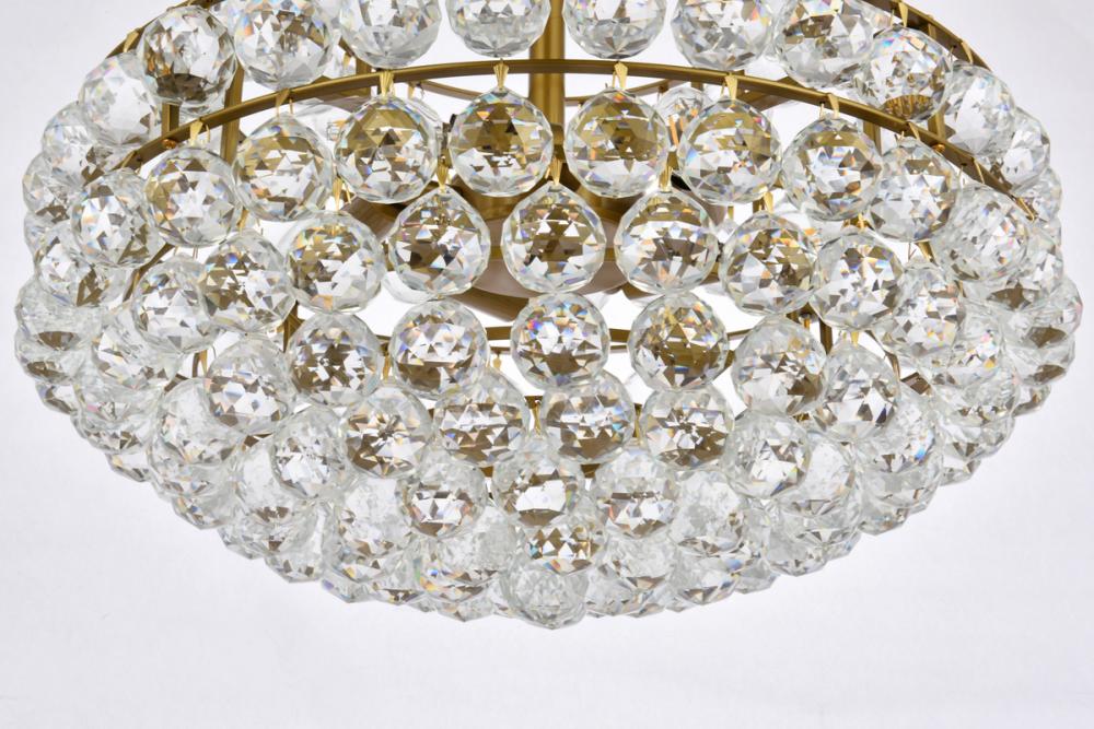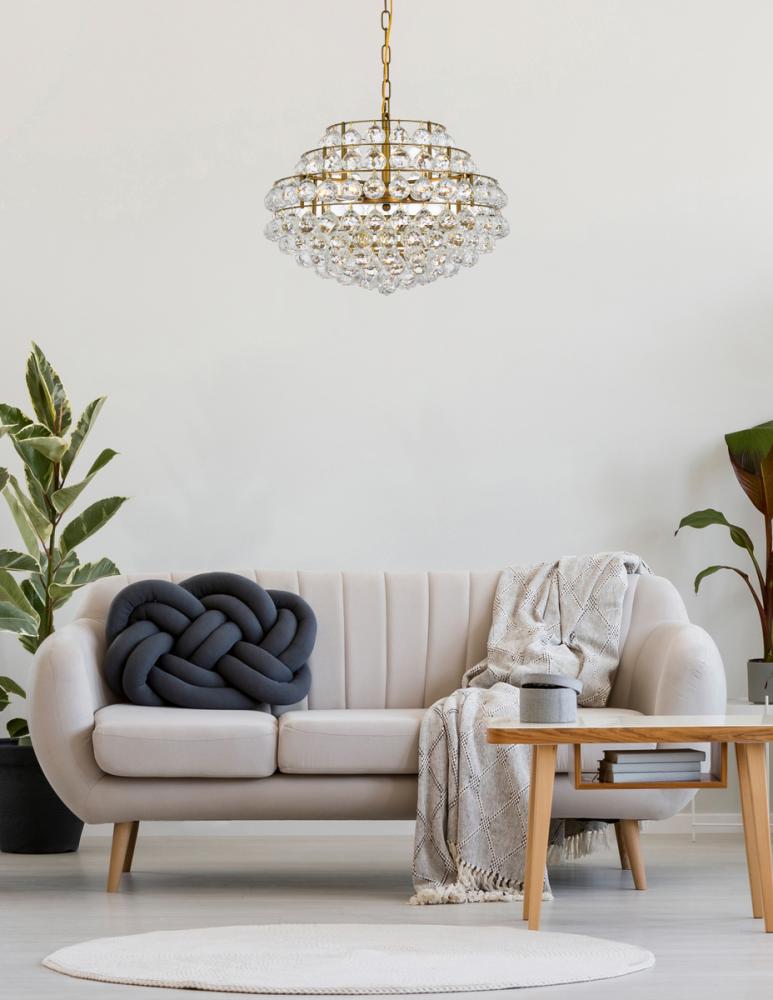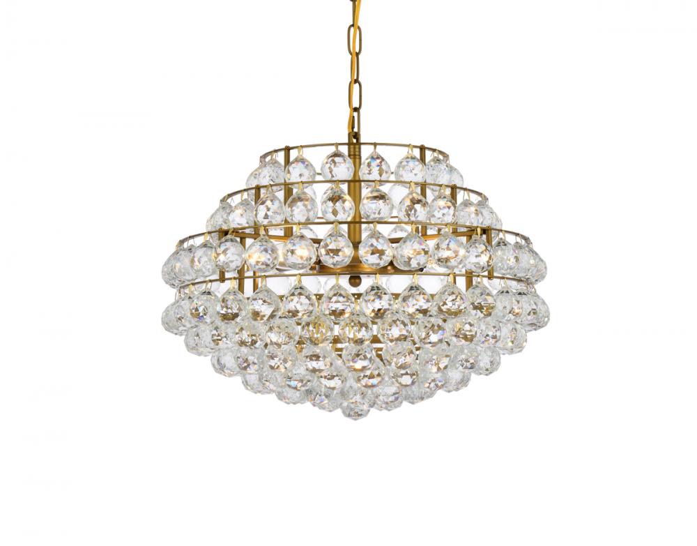 Tiers of clear multi-faceted crystals reflect the soft glow of candelabra bulbs