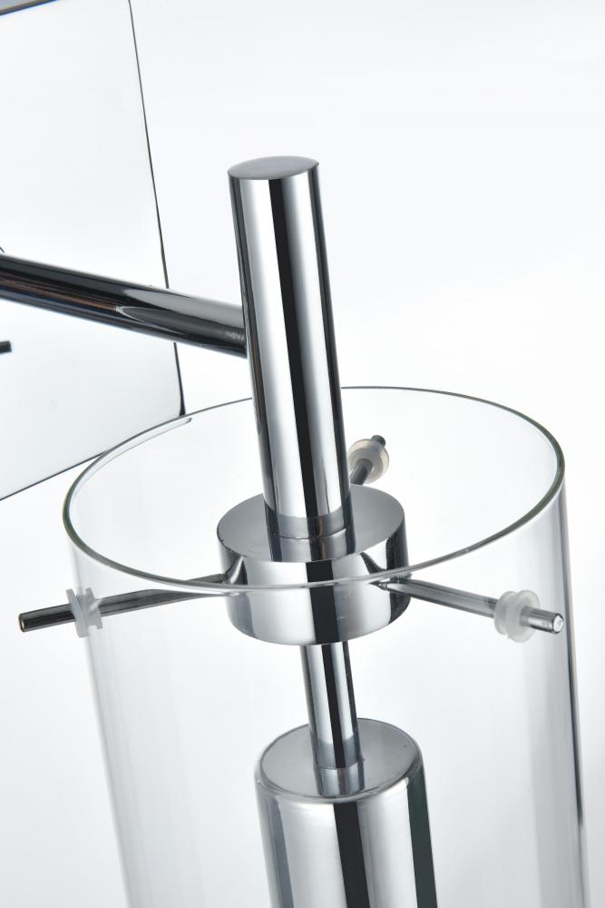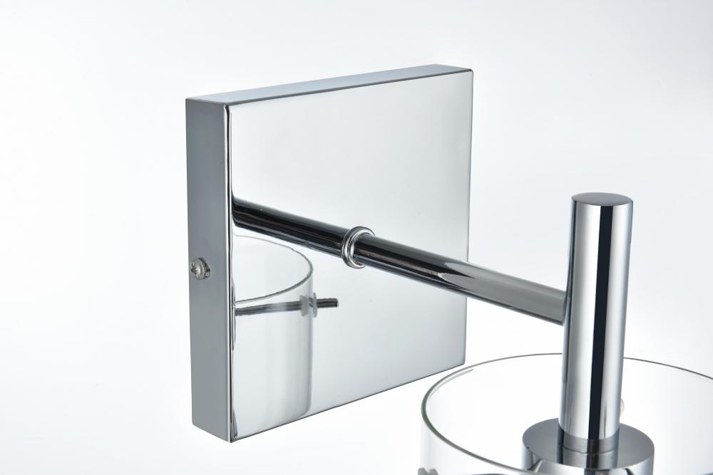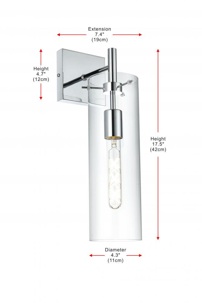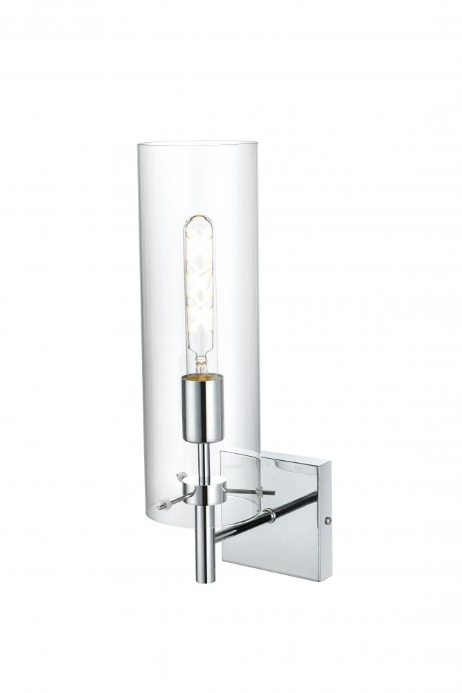 Elevate the ambiance of your space with this stunning wall sconce. Featuring a sleek chrome finish, this wall sconce blends modern style with classic elegance. The short metal arm supports a cylindrical clear glass shade that beautifully showcases the bulb, adding a striking architectural detail. Its minimalist square backplate and short torch-like design create a sophisticated silhouette, perfect for any room—from a hallway or living room to a bathroom or bedroom. The chrome finish adds a reflective quality that enhances its modern appeal while complementing other metallic accents in your decor. This sconce requires one E26 socket bulb (not included) and is compatible with dimmable features, allowing you to set the perfect lighting mood.