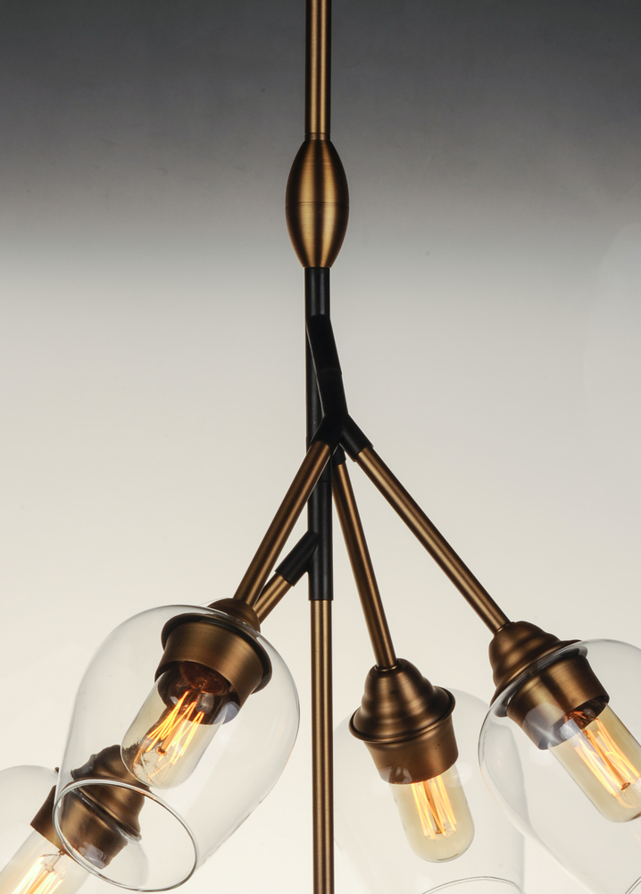 Clear glass goblets are supported by multiple arms of Black and Antique Brass originating from a center collector. This collection is made even more unique by the vintage T14 spiral filament lamps which are supplied with each fixture.