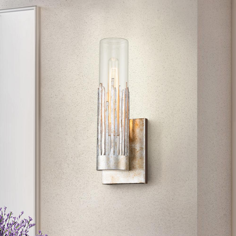 Sawgrass 1 sconce in silver leaf. Grass like pattern offered in transitional design with glass candle cover of 1 60w light of ADA compliant sconce.