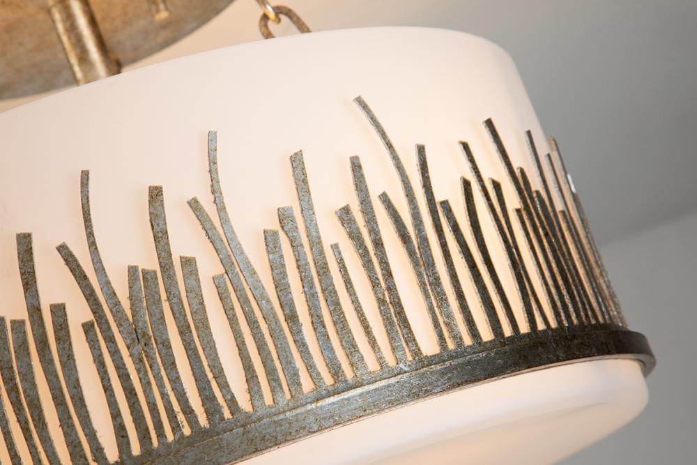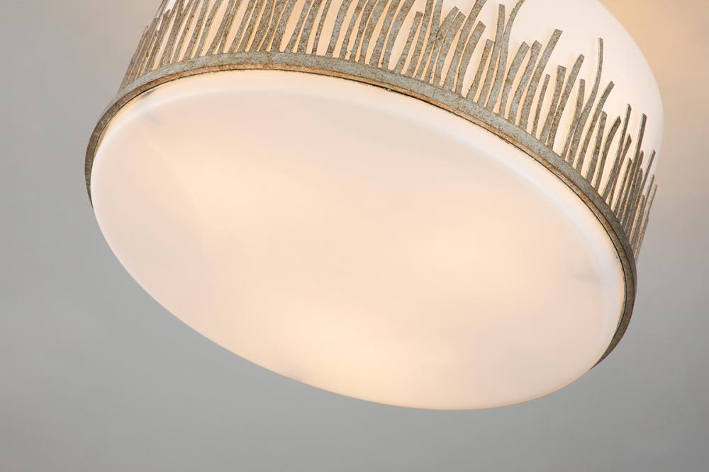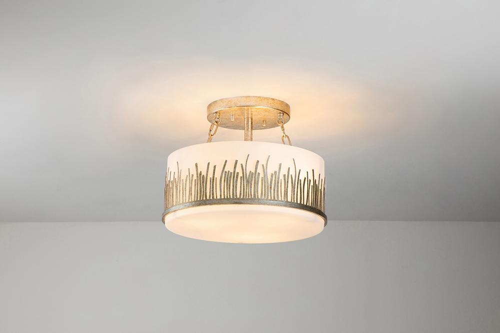 A graceful 15" dia., 11.5" high semi-flush light in silver leaf. Frosted glass in a silver grass-like holder offers a spa-like silhouette. Ideal for bathrooms, dining, or nooks, it blends timeless design with detailed light play.