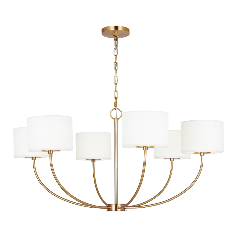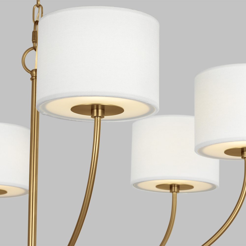 Inspired by kate spade whimsical geometry and playful lines, Sawyer has a striking silhouette with graphically taped shades. The Sawyer medium chandelier by kate spade New York in burnished brass is a wide playful chandelier with arched lines and wide, graphically taped shades. This simple and graphic chandelier would be great over a dining table or nook, as well as in a living room scenario.