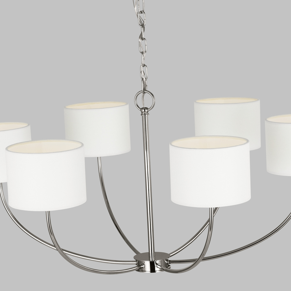 Inspired by kate spade whimsical geometry and playful lines, Sawyer has a striking silhouette with graphically taped shades. The Sawyer medium chandelier by kate spade New York in polished nickel is a wide playful chandelier with arched lines and wide, graphically taped shades. This simple and graphic chandelier would be great over a dining table or nook, as well as in a living room scenario.