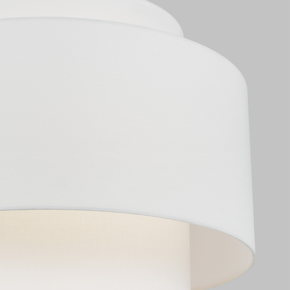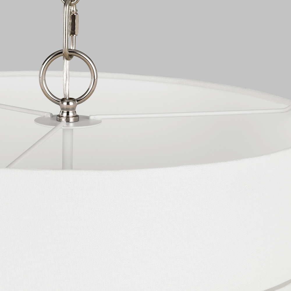 The Sawyer pendant in polished nickel is inspired by kate spade whimsical geometry and playful lines, Sawyer has a striking silhouette with graphically taped shades. A wide double tiered pendant shade with graphically taped shades. Great over a dining table or nook, or in multiples over an island.