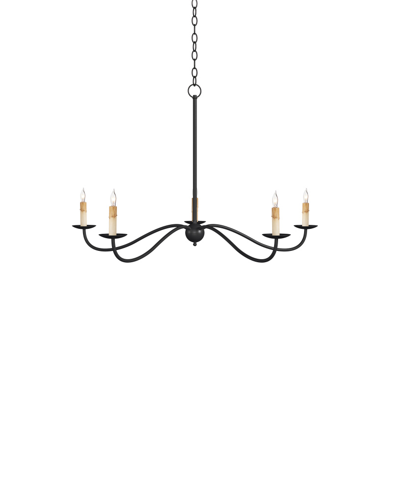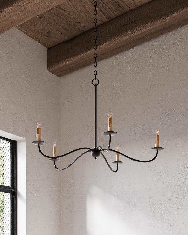 The Saxon Small Black Chandelier is one of our most graceful chandeliers with arms that fluidly stretch outward. Its shape and the Zanzibar black finish are nods to a bygone era, but its arcing slender lines make its profile modern. Adjustable from 27.5" to 96" with use of included chain/rod kit/cable. If your space calls for a longer drop, additional chain/rods/cable is available for purchase.