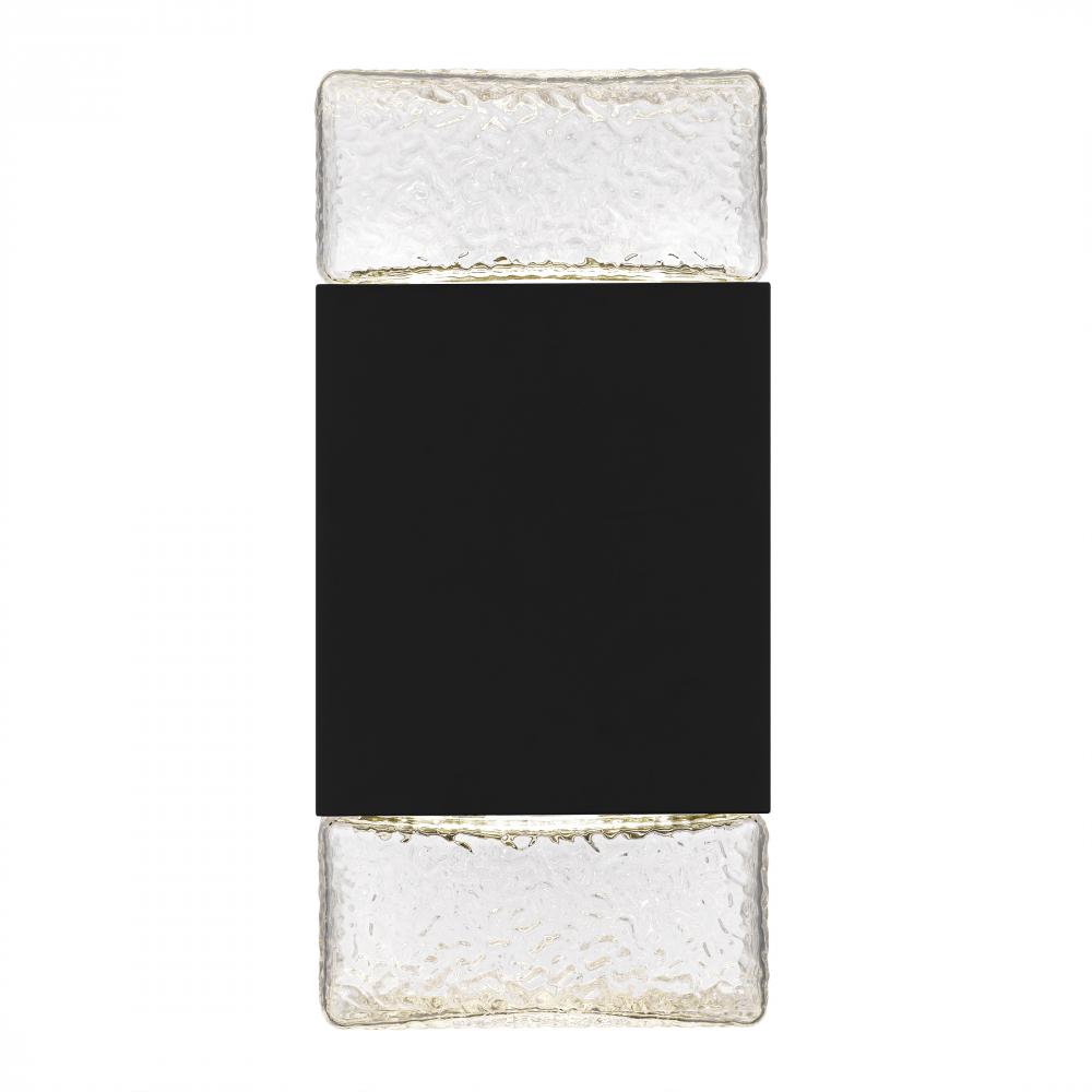Elevate your homes exterior with the contemporary style of Saxton wall lanterns. Featuring a sleek frame finished in matte black, this lantern is complemented by clear textured glass that allows the integrated LED light source to shine brilliantly both upw