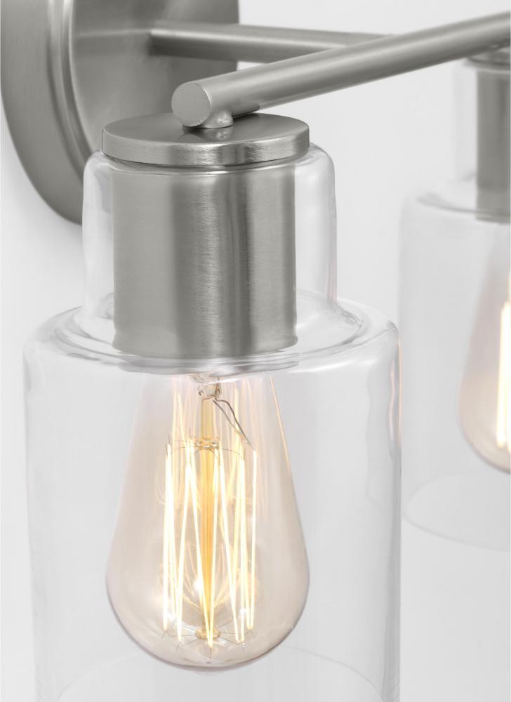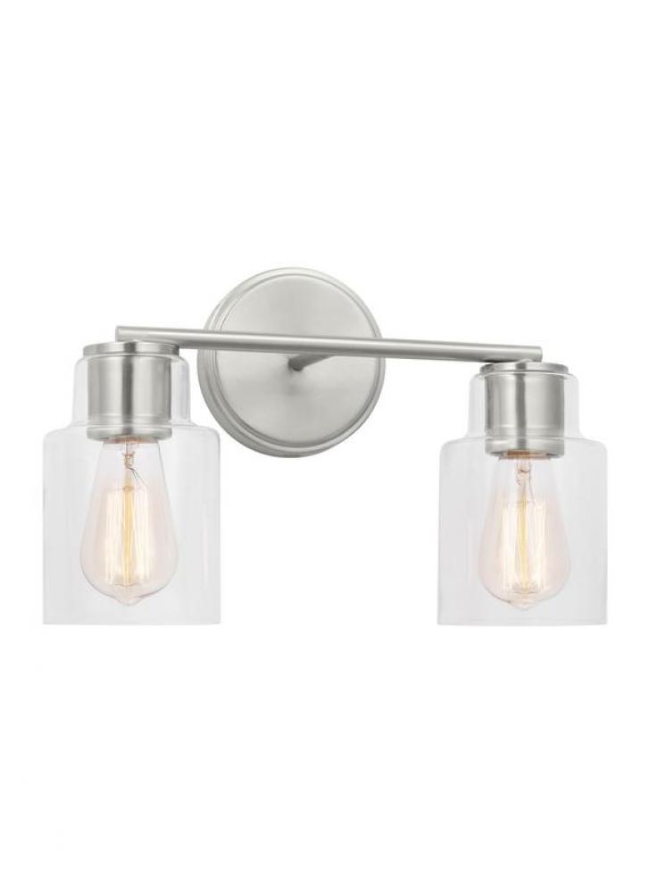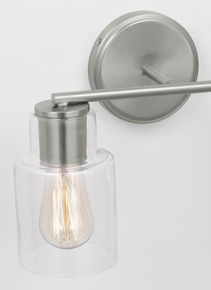Add a bright burst of light where you need it most with the classic Drew & Jonathan Sayward Two Light Wall / Bath Sconce, featuring a round metal backplate and clear glass shades. Made to coordinate across a broader range of bath hardware and design styles, the Sayward is available in four popular finishes, Brushed Steel, Chrome, Midnight Black, and Satin Brass. This light looks great on its own or installed above a bathroom vanity, and the glass shades make it ideal for filament bulbs. This fixture may be mounted in the up or down position, and is cETL listed for damp locations, making it the perfect lighting solution for any space.