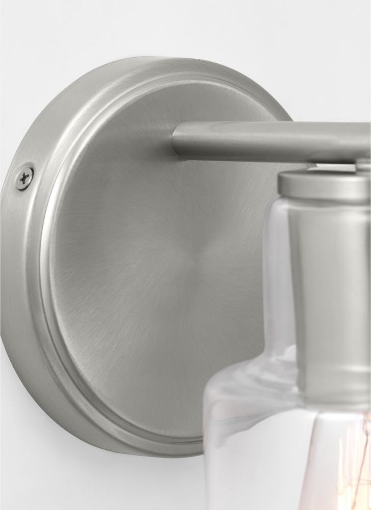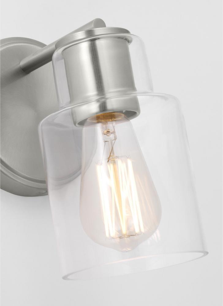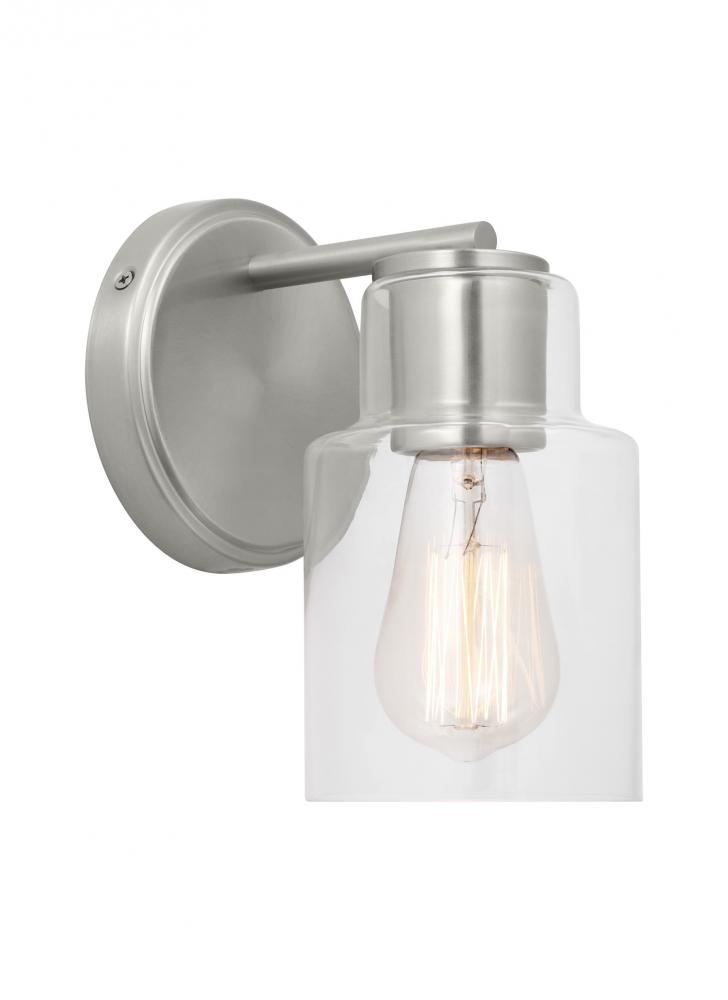 Add a bright burst of light where you need it most with the classic Drew & Jonathan Sayward Small Sconce, featuring a round metal backplate and clear glass shade. Made to coordinate across a broader range of bath hardware and design styles, the Sayward is available in four popular finishes, Brushed Steel, Chrome, Midnight Black, and Satin Brass. This light looks great on its own or installed above a bathroom vanity, and the glass shade makes it ideal for filament bulbs. This fixture may be mounted in the up or down position, and is cETL listed for damp locations, making it the perfect lighting solution for any space.