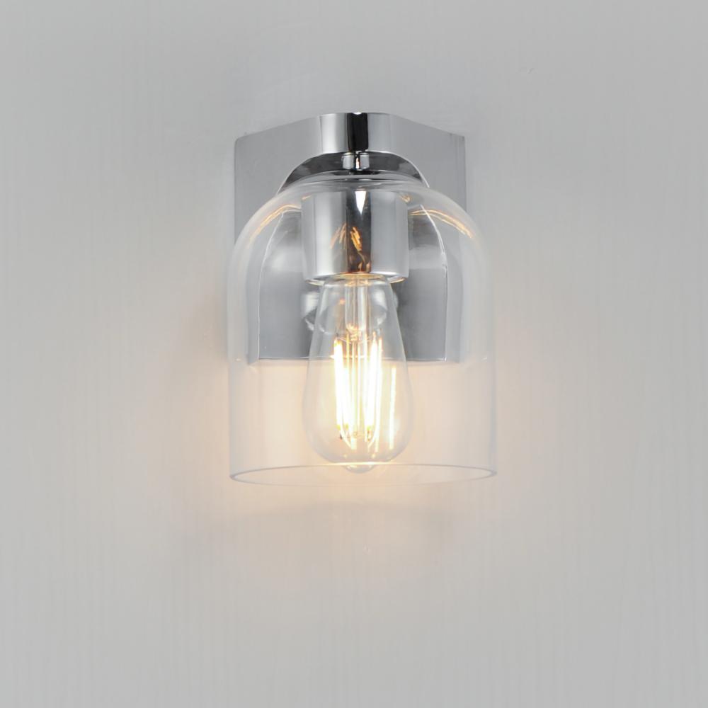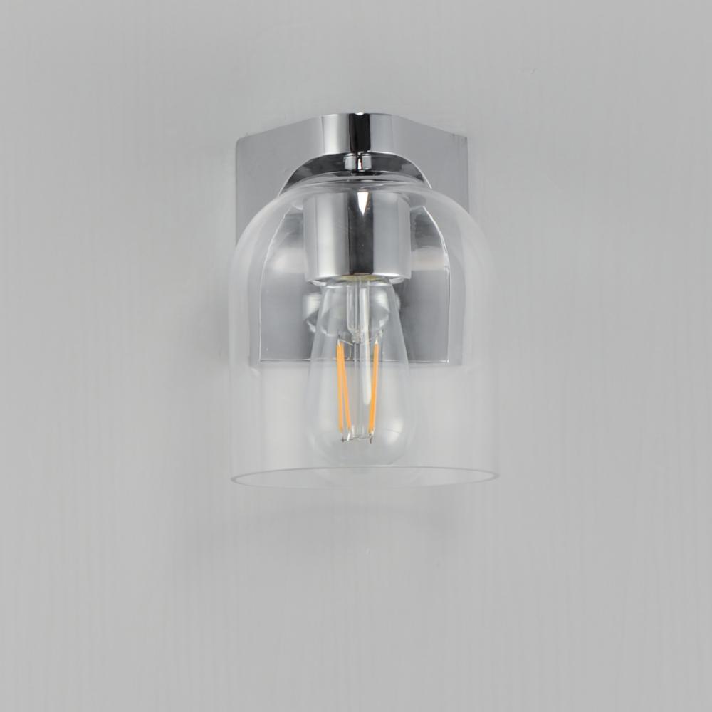 Cut-out metalwork curves around modern bell-shaped glass shades. The series includes pendants and bath vanities available in either Clear or a swirling Marble glass. Available in various complementary finishes: Polished Chrome, Matte Black, or Natural Aged