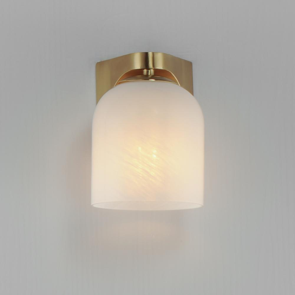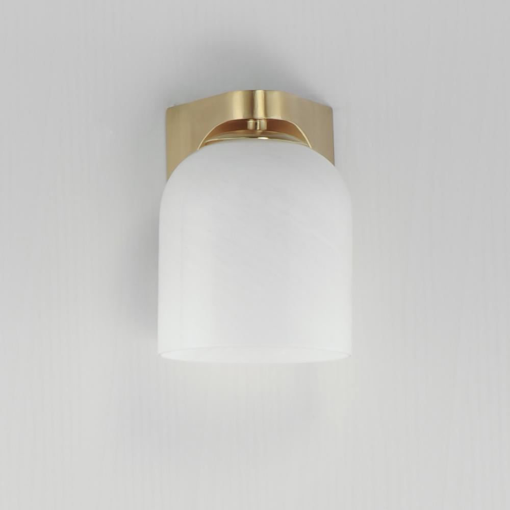 Cut-out metalwork curves around modern bell-shaped glass shades. The series includes pendants and bath vanities available in either Clear or a swirling Marble glass. Available in various complementary finishes: Polished Chrome, Matte Black, or Natural Aged