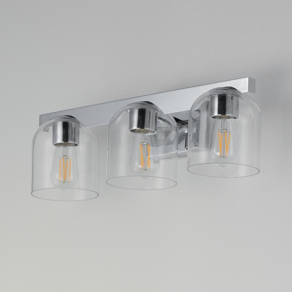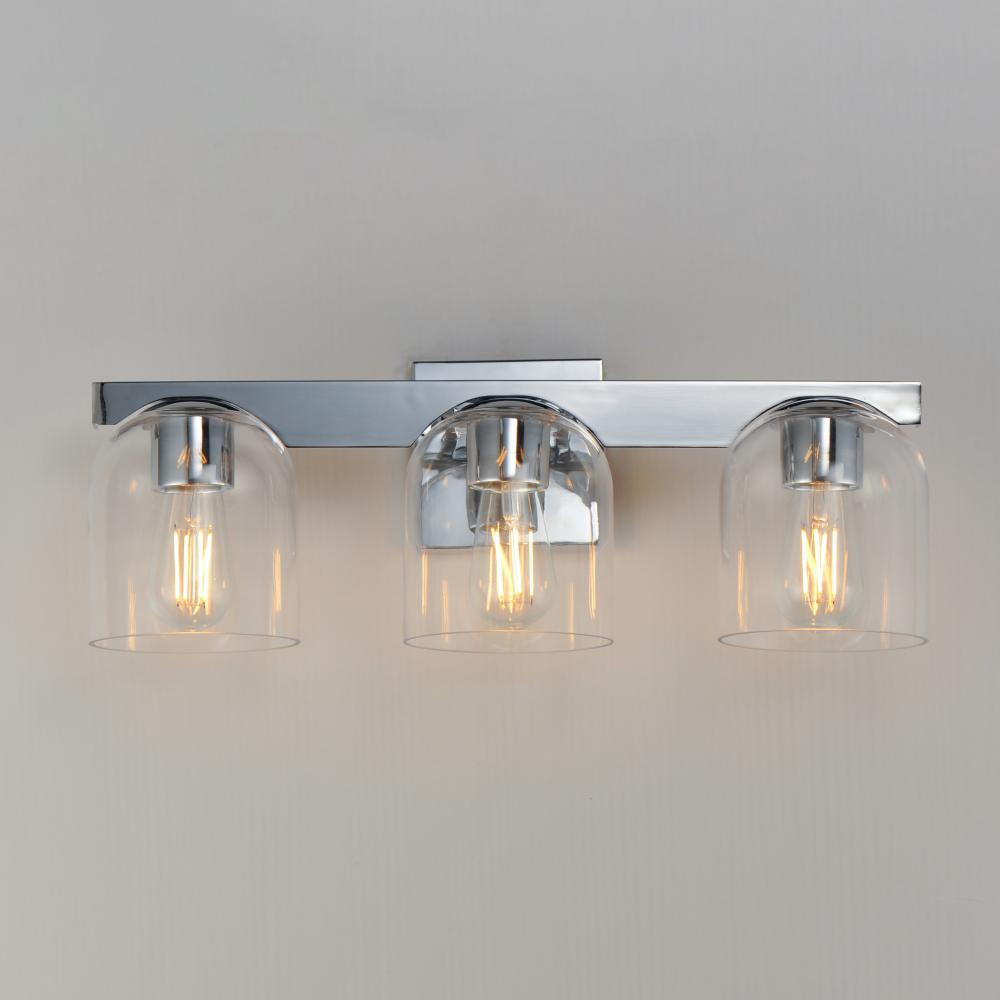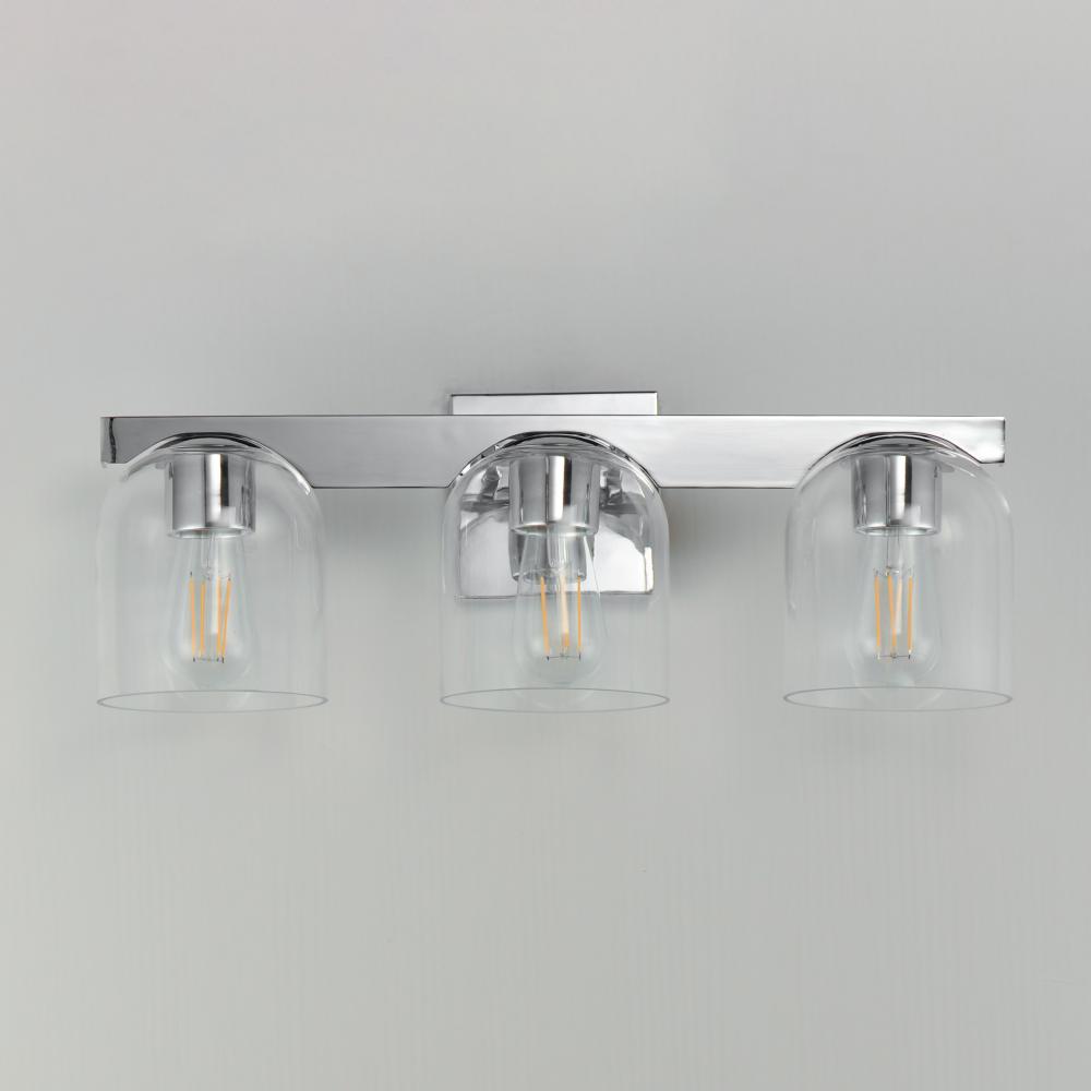 Cut-out metalwork curves around modern bell-shaped glass shades. The series includes pendants and bath vanities available in either Clear or a swirling Marble glass. Available in various complementary finishes: Polished Chrome, Matte Black, or Natural Aged