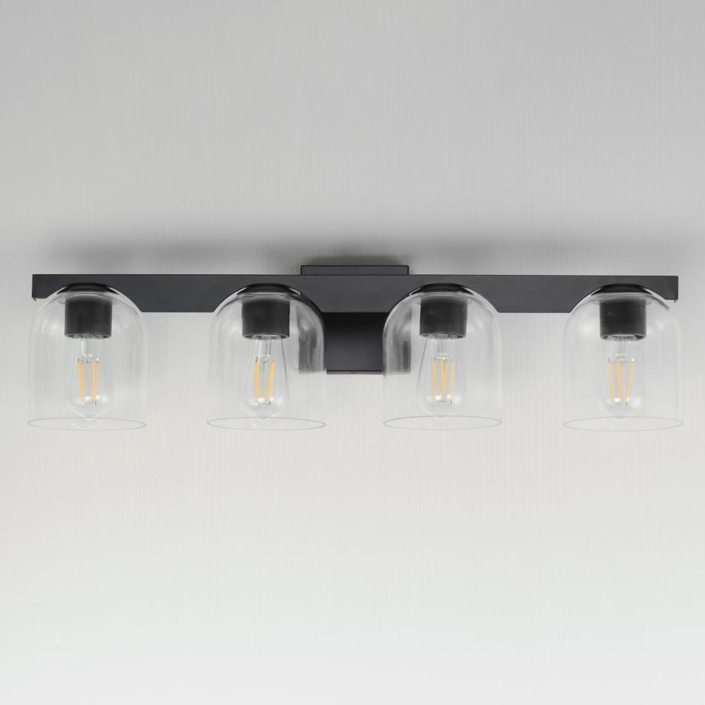 Cut-out metalwork curves around modern bell-shaped glass shades. The series includes pendants and bath vanities available in either Clear or a swirling Marble glass. Available in various complementary finishes: Polished Chrome, Matte Black, or Natural Aged