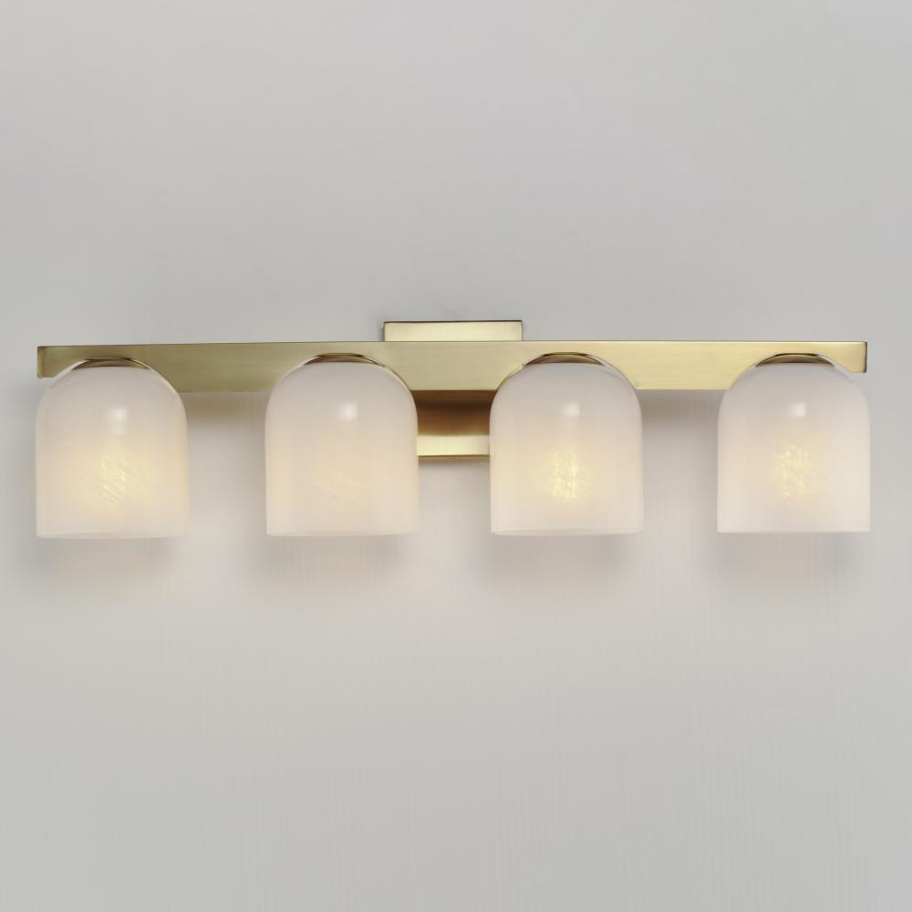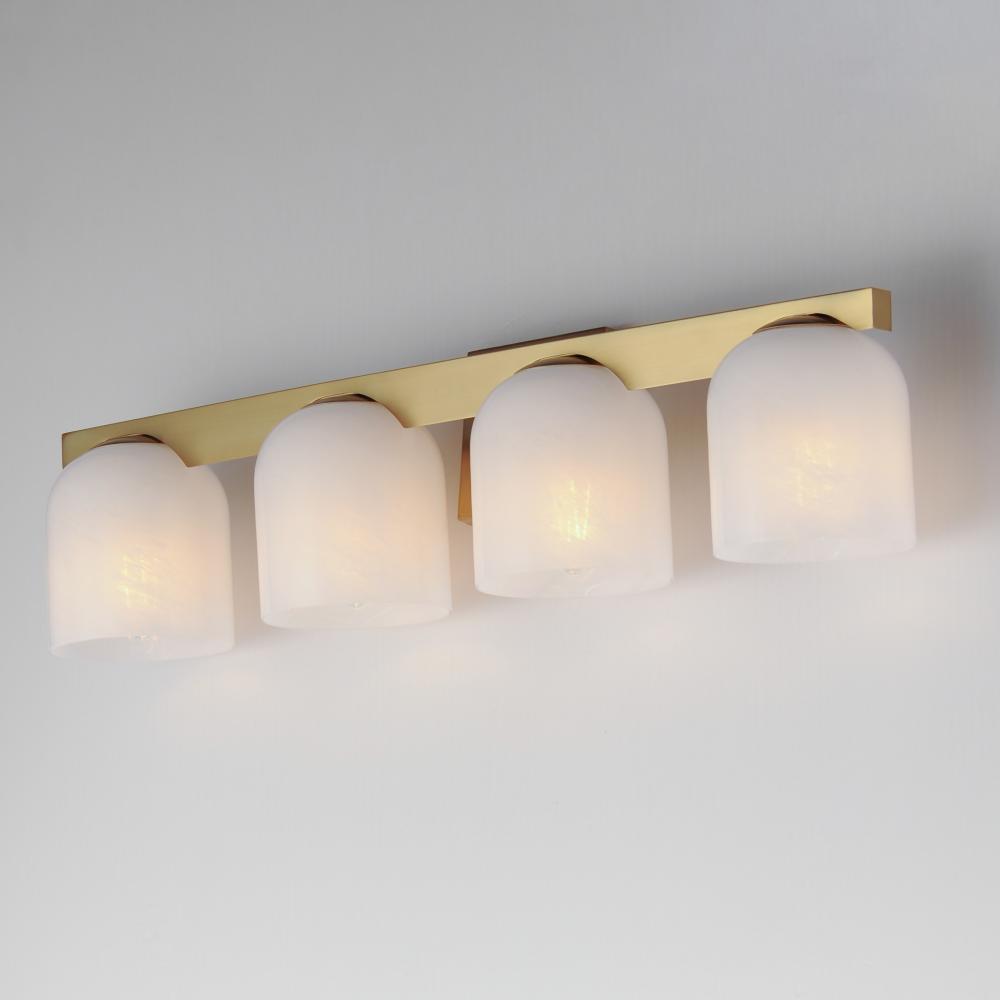 Cut-out metalwork curves around modern bell-shaped glass shades. The series includes pendants and bath vanities available in either Clear or a swirling Marble glass. Available in various complementary finishes: Polished Chrome, Matte Black, or Natural Aged