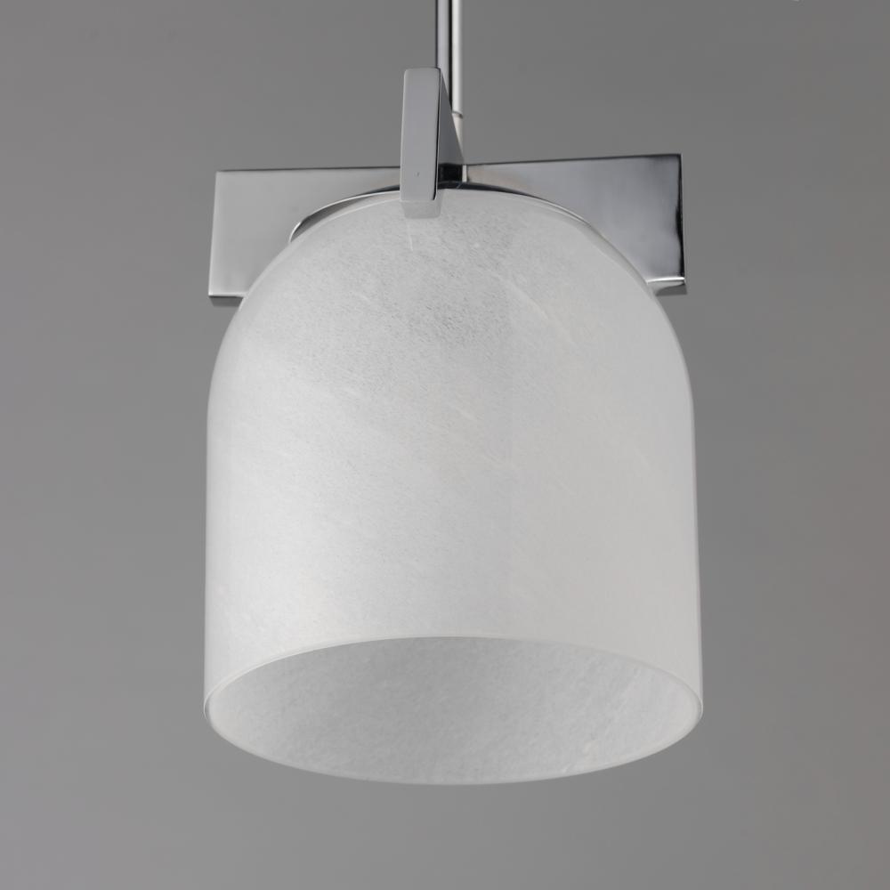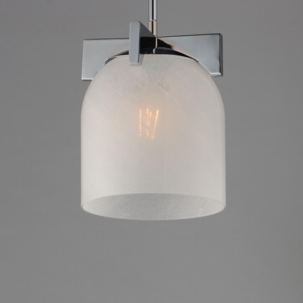 Cut-out metalwork curves around modern bell-shaped glass shades. The series includes pendants and bath vanities available in either Clear or a swirling Marble glass. Available in various complementary finishes: Polished Chrome, Matte Black, or Natural Aged