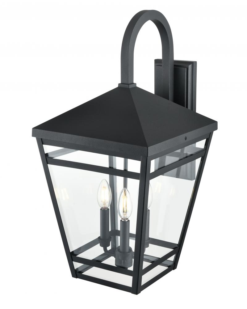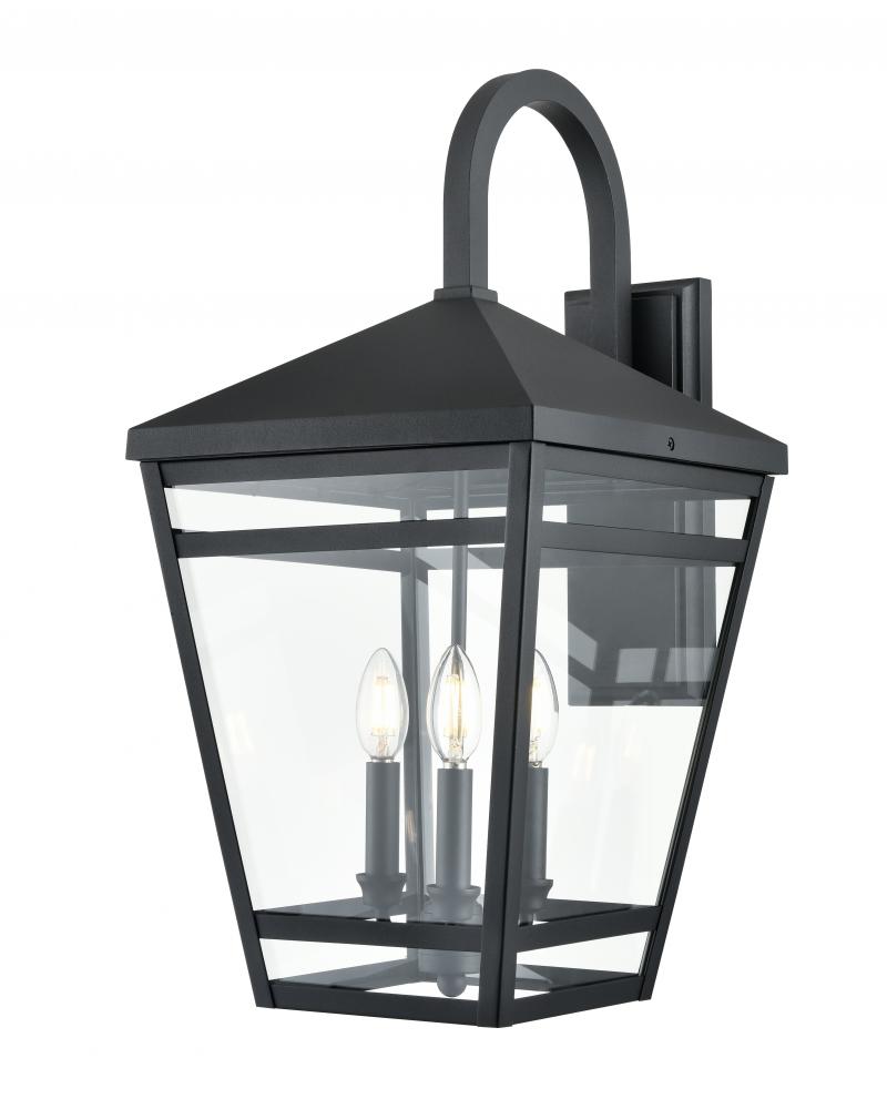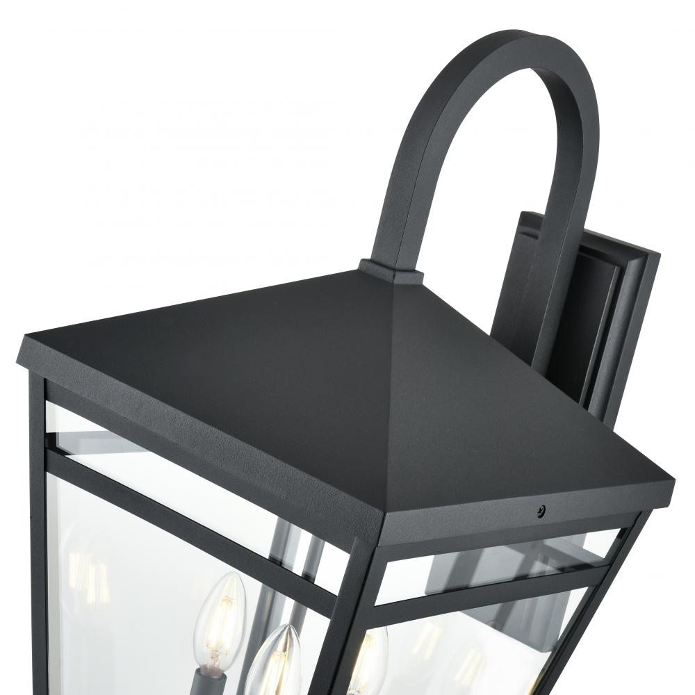 The Seager Family of outdoor lighting provides a sophisticated air to any exterior entry or walkway. The Georgian-style sconces, available as 1-, 2-, and 3-light options, or the 3-light pendant are constructed of aluminum and finished in elegant textured black. Metal banding and crystal-clear glass infuse a subtle modern touch to the classic profile.