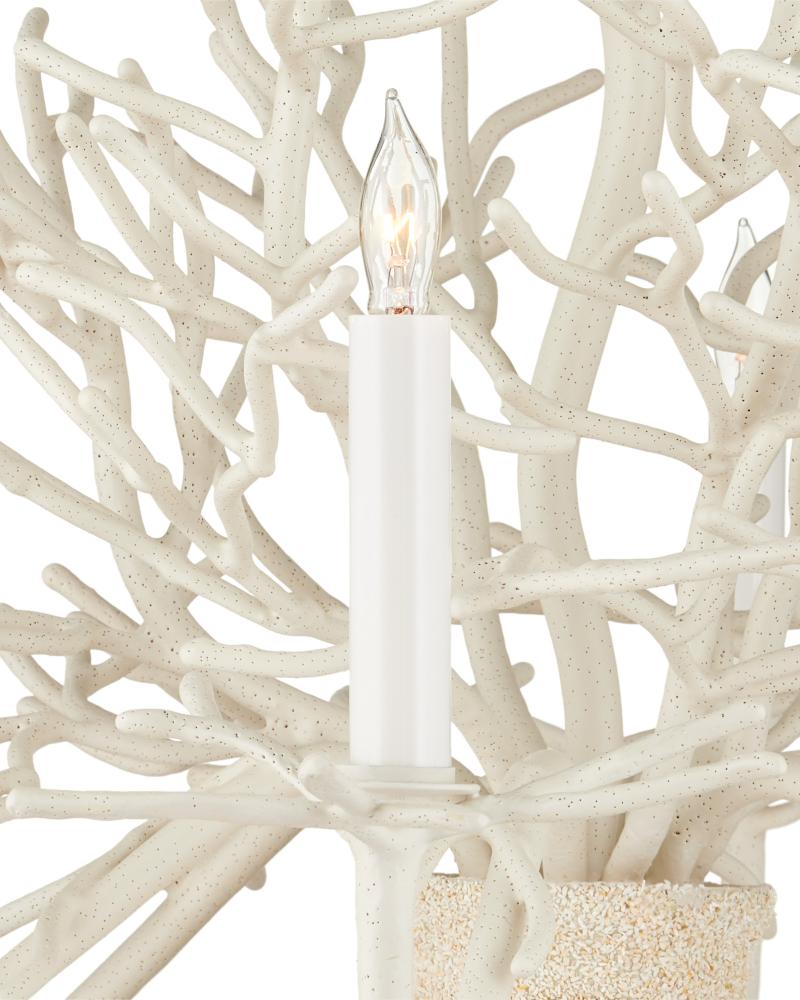 As enigmatically lovely as a coral reef, this small version of the Seaward Chandelier brings the feel of the world’s great oceans into a space with its masterfully executed tribute to the deep. Wrought iron, which is beautifully sculpted to resemble white coral, is covered in an application of sand that completes the mysterious transformation from metal to marine skeleton. This lovely six-light chandelier is anchored at the bottom by a textural pot from which its arms of coral richly extend. We also offer the Seaward in a larger chandelier and in a wall sconce.