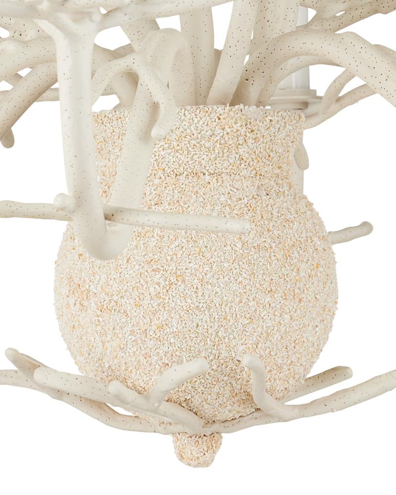 The Seaward Small Chandelier is made of wrought iron beautifully sculpted to resemble white coral. Covered in an application of sand, this lovely ivory chandelier is anchored at the bottom by a textural pot from which its arms extend. Adjustable from 34" to 101" with use of included chain/rod kit/cable. If your space calls for a longer drop, additional chain/rods/cable is available for purchase.