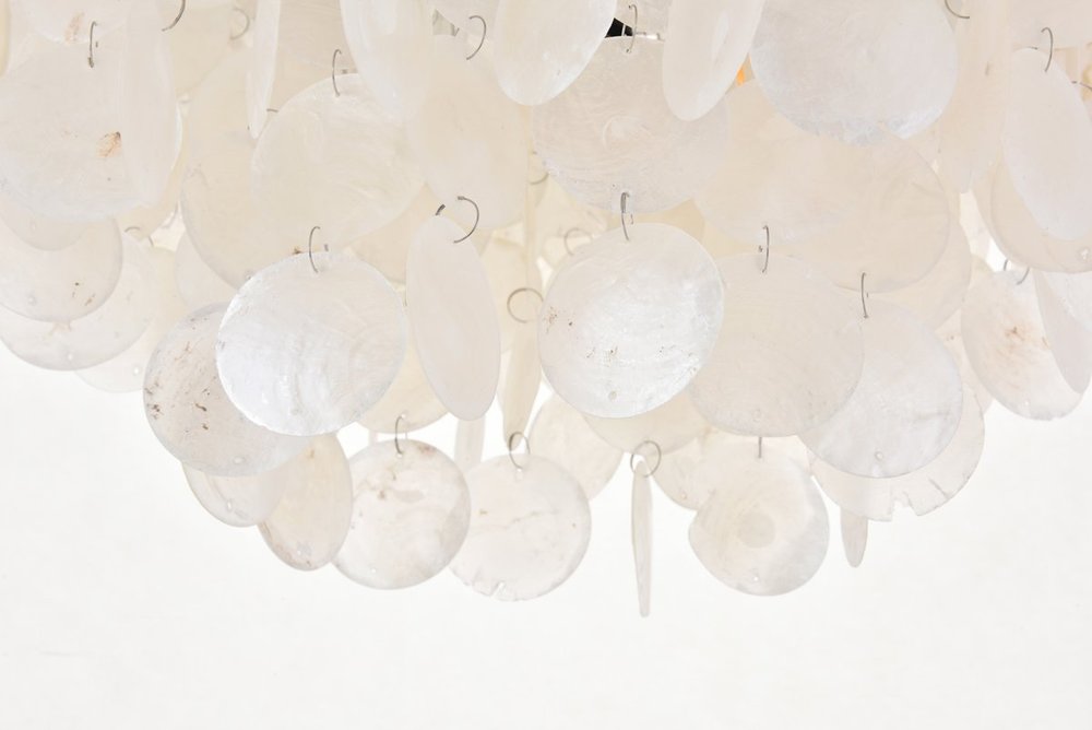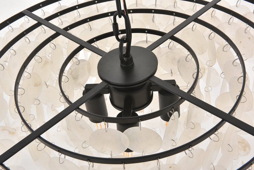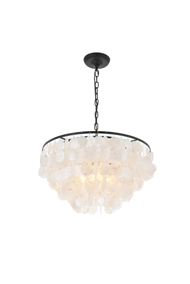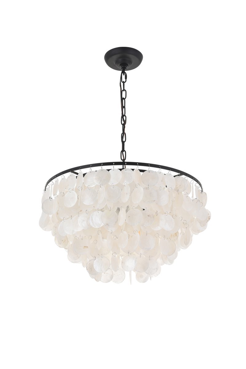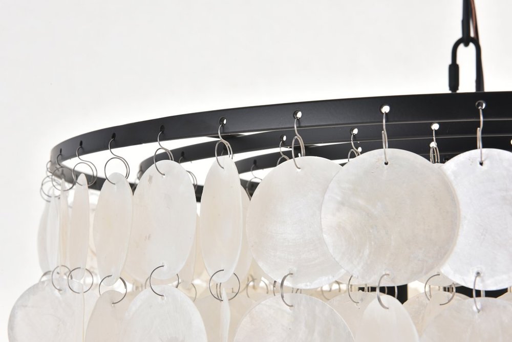 Black finish pendant with dreamy off-white shells adorning the tiers