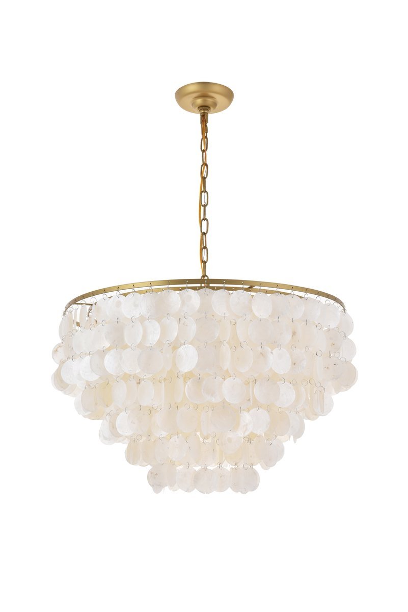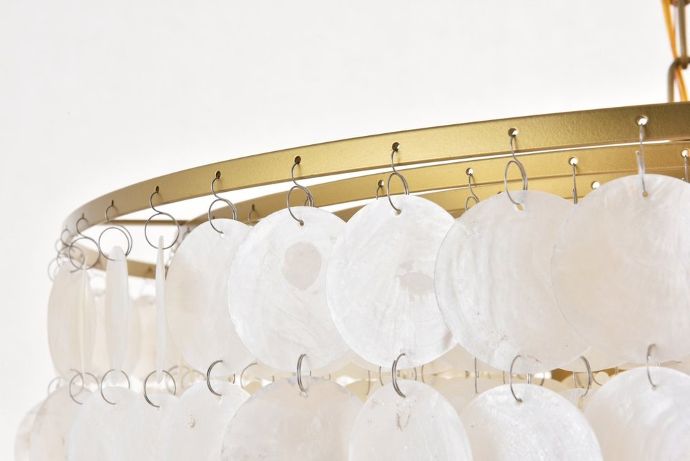 Brass finish pendant with dreamy off-white shells adorning the tiers