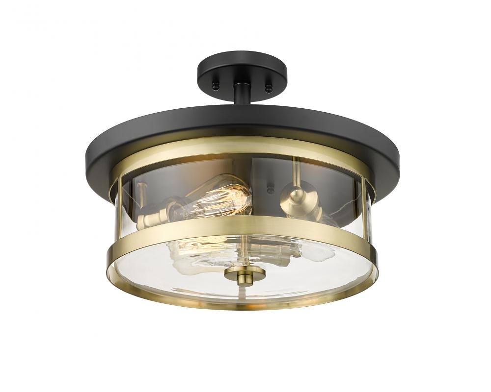 This semi flush mount is in a black and gold finish. It comes with a clear glass shade and the bulbs are not included.