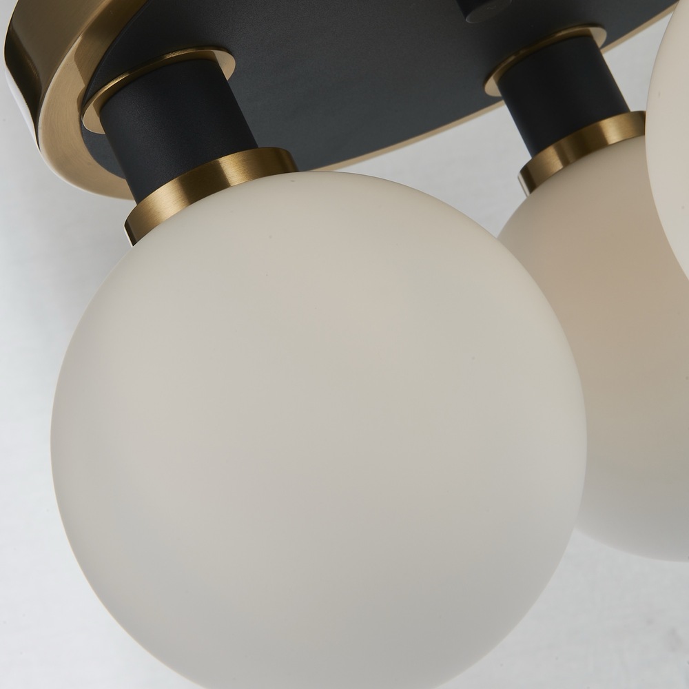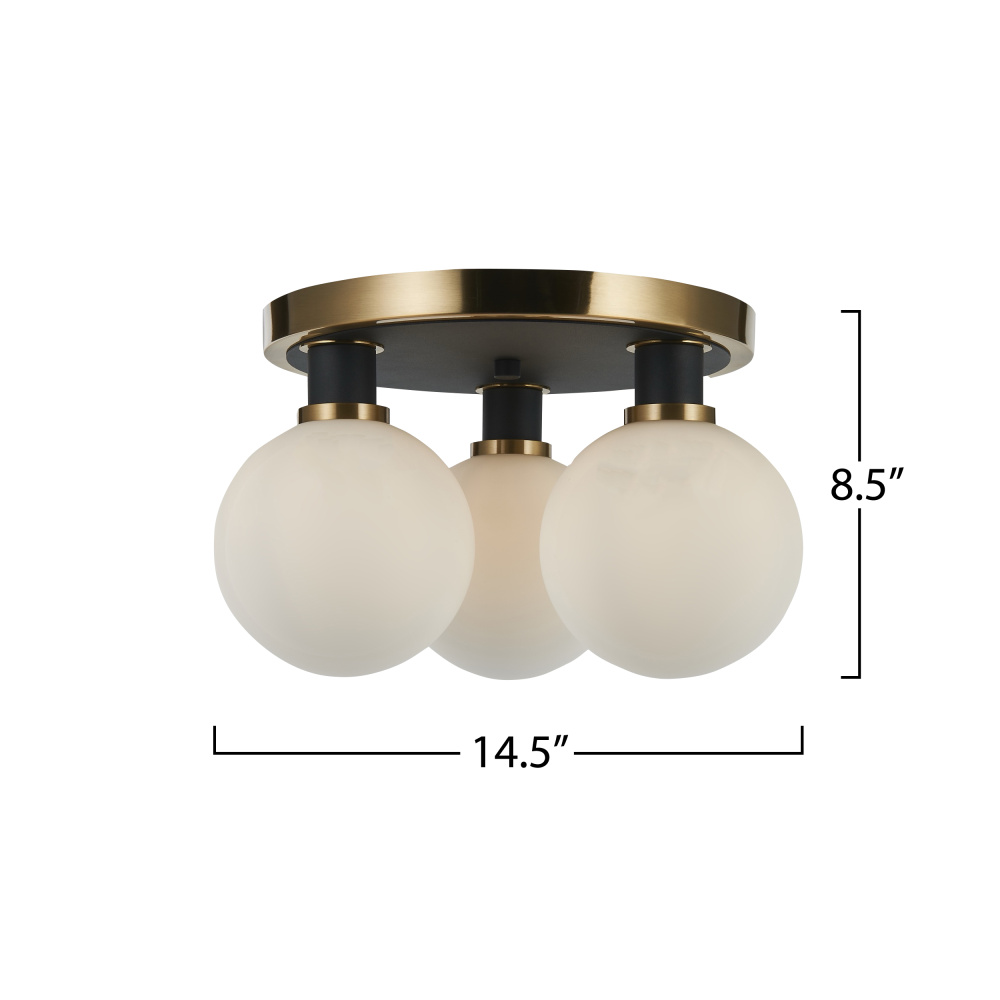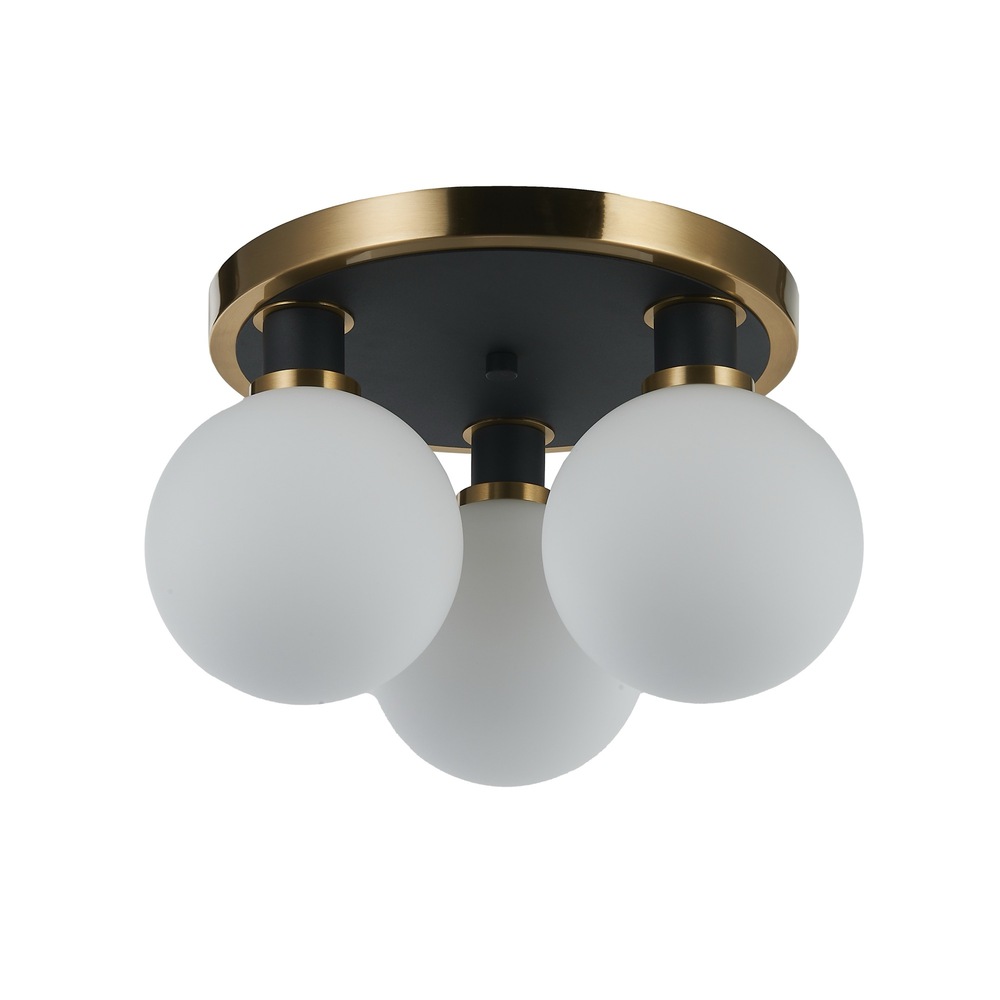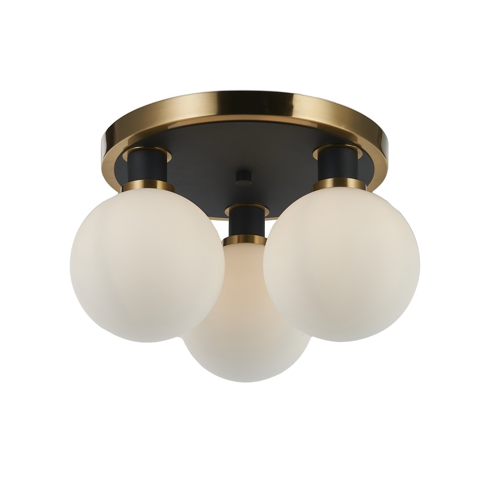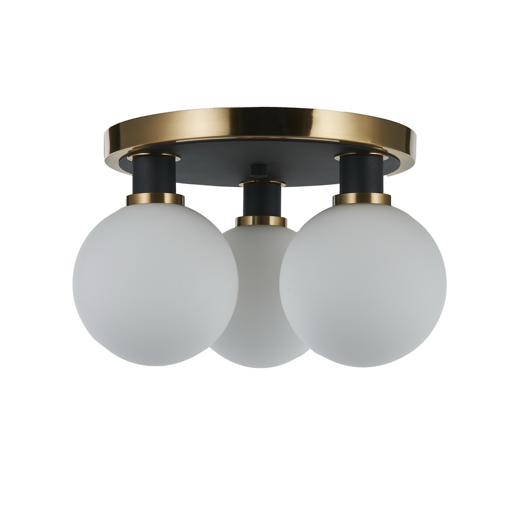 The Gem collection with acid white glass, also known as etched glass, is a type of glass that has undergone a process to give it a rich cloudy white appearance. When illuminated this glassware has a warm hue, which compliments its two-tone black and brushed brass framing. This model is a 3 lite semi flushmount.