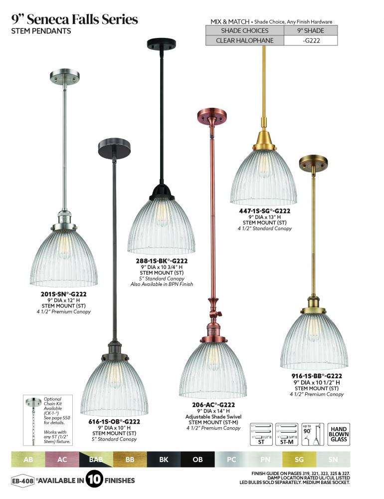 The Edison collection is comprised of heavy cast components that give the fixture a sturdy transitional look. We offer the fixture in 9 finishes with a Bare Bulb look or with over 100 possible metal and glass shade options that can change the style to fit