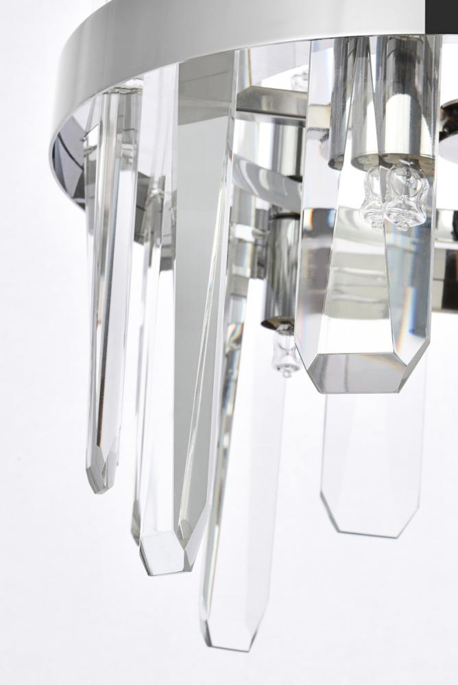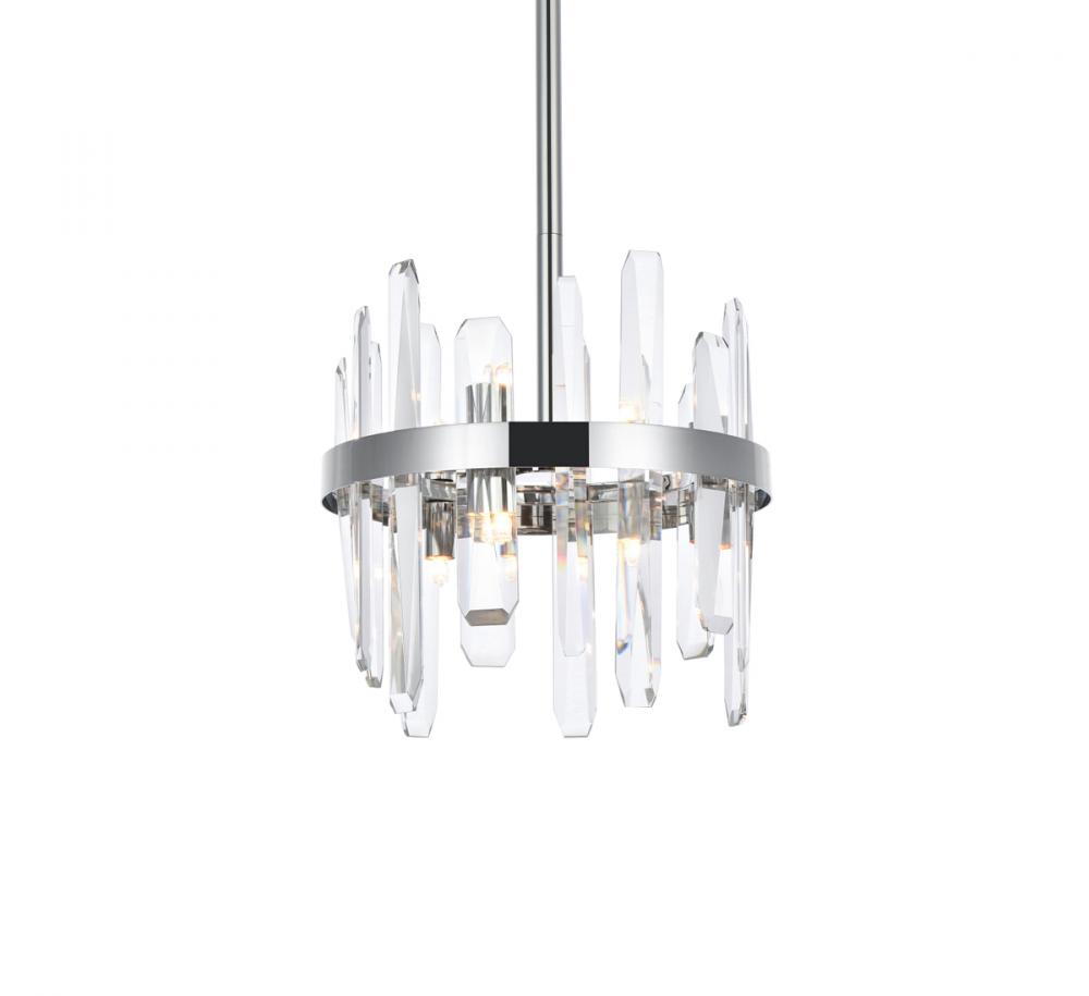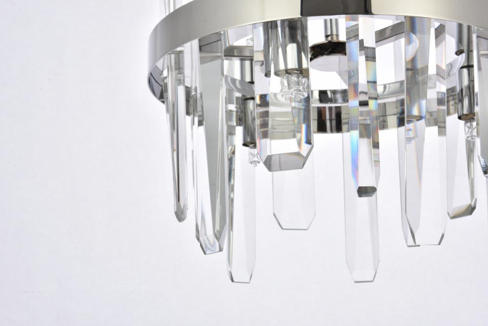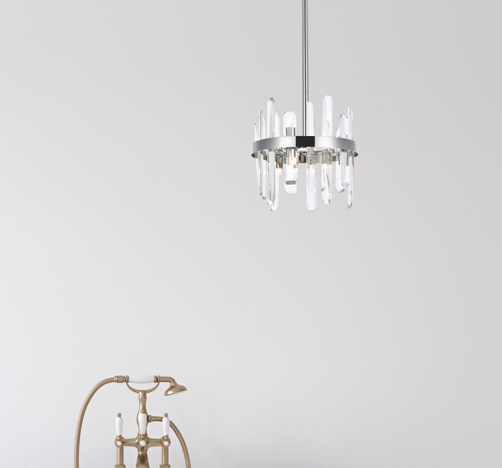 Modern crystal chandelier features top and bottom tier crystal prisms staggered along the wrought iron frame. The thick metal frame wraps around top grade crystal prisms ensure it is built to last, definitely worth it. Hang this work of art and dim the lights for a bit of sophisticated lighting in your home. Get lost in a beautiful light and sleek design available in multiple finishes. The hanging rod conveniently comes with a slope ceiling adapter, perfect for your vaulted or angled ceiling.