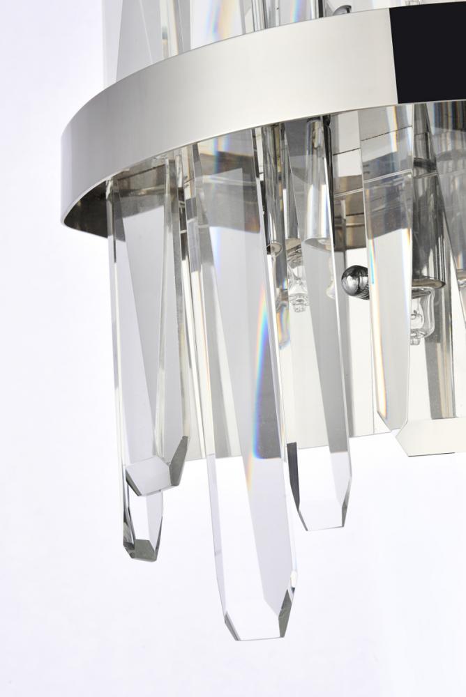 Modern crystal wall sconce features top and bottom tier crystal prisms staggered along a wrought iron frame. The thick metal frame wraps around top grade crystal prisms ensure it is built to last, definitely worth it. Mount this work of art and dim the lights for a bit of sophisticated lighting in your home. Get lost in a beautiful light and sleek design available in multiple finishes.