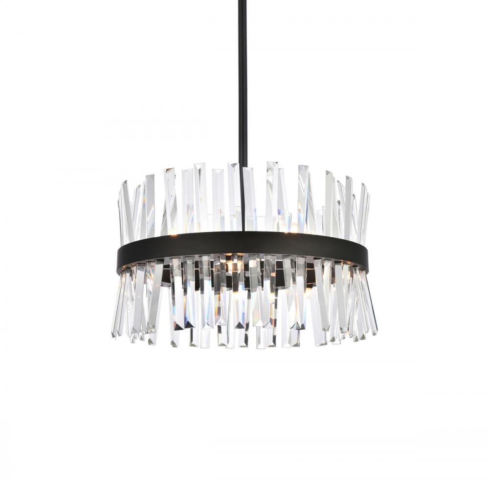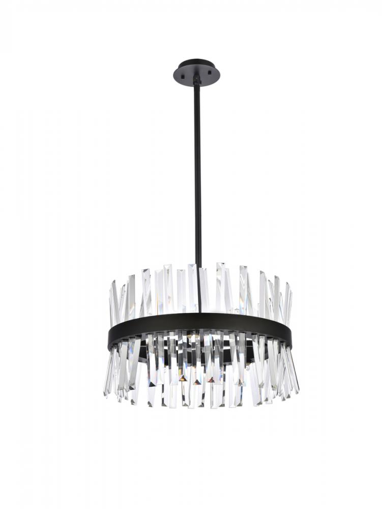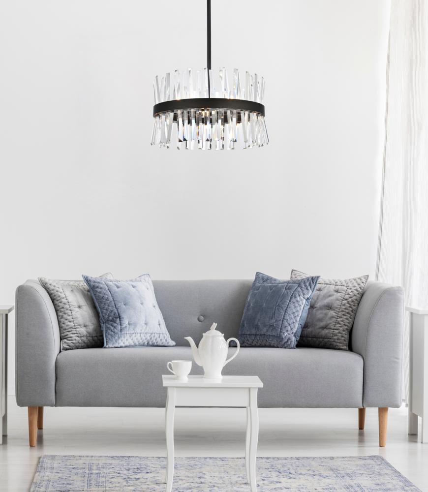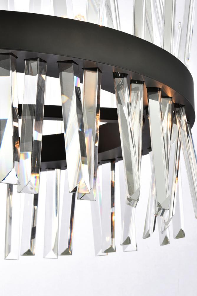 Modern crystal chandelier features top and bottom tier crystal prisms staggered along the wrought iron frame. The thick metal frame wraps around top grade crystal prisms ensure it is built to last, definitely worth it. Hang this work of art and dim the lights for a bit of sophisticated lighting in your home. Get lost in a beautiful light and sleek design available in multiple finishes. The hanging rod conveniently comes with a slope ceiling adapter, perfect for your vaulted or angled ceiling.