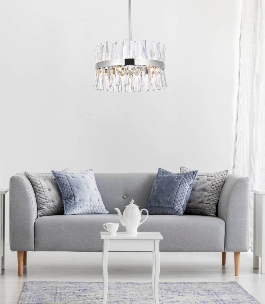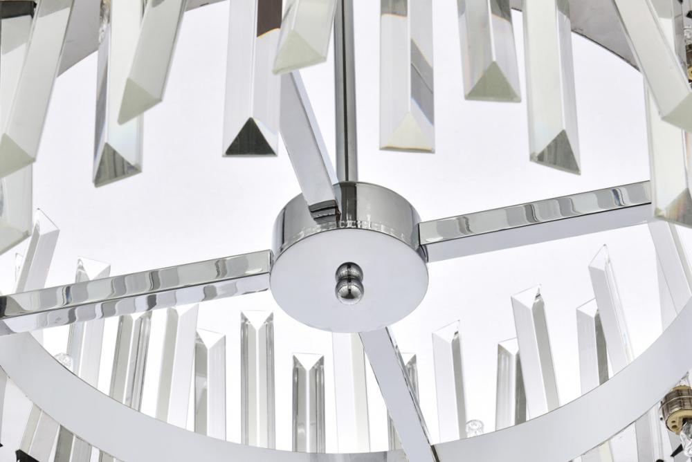 Modern crystal chandelier features top and bottom tier crystal prisms staggered along the wrought iron frame. The thick metal frame wraps around top grade crystal prisms ensure it is built to last, definitely worth it. Hang this work of art and dim the lights for a bit of sophisticated lighting in your home. Get lost in a beautiful light and sleek design available in multiple finishes. The hanging rod conveniently comes with a slope ceiling adapter, perfect for your vaulted or angled ceiling.