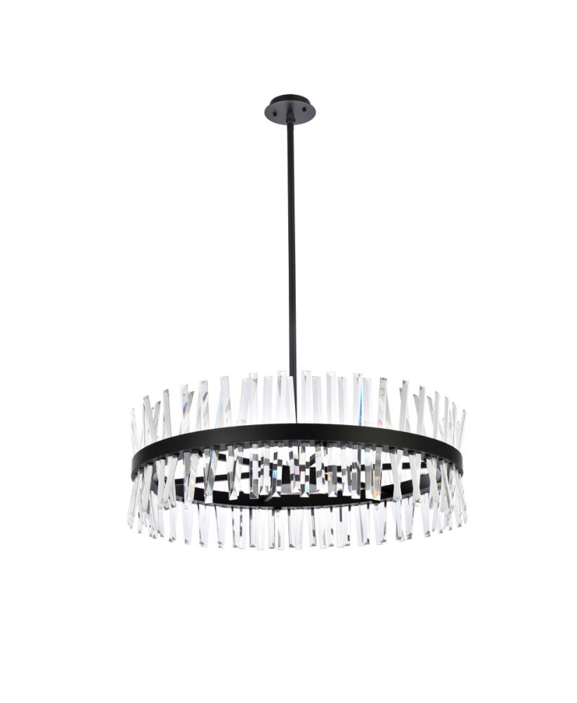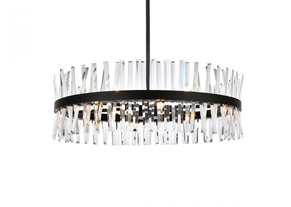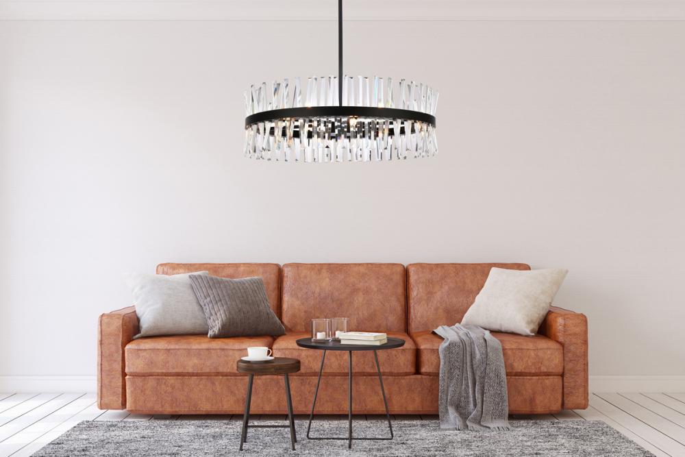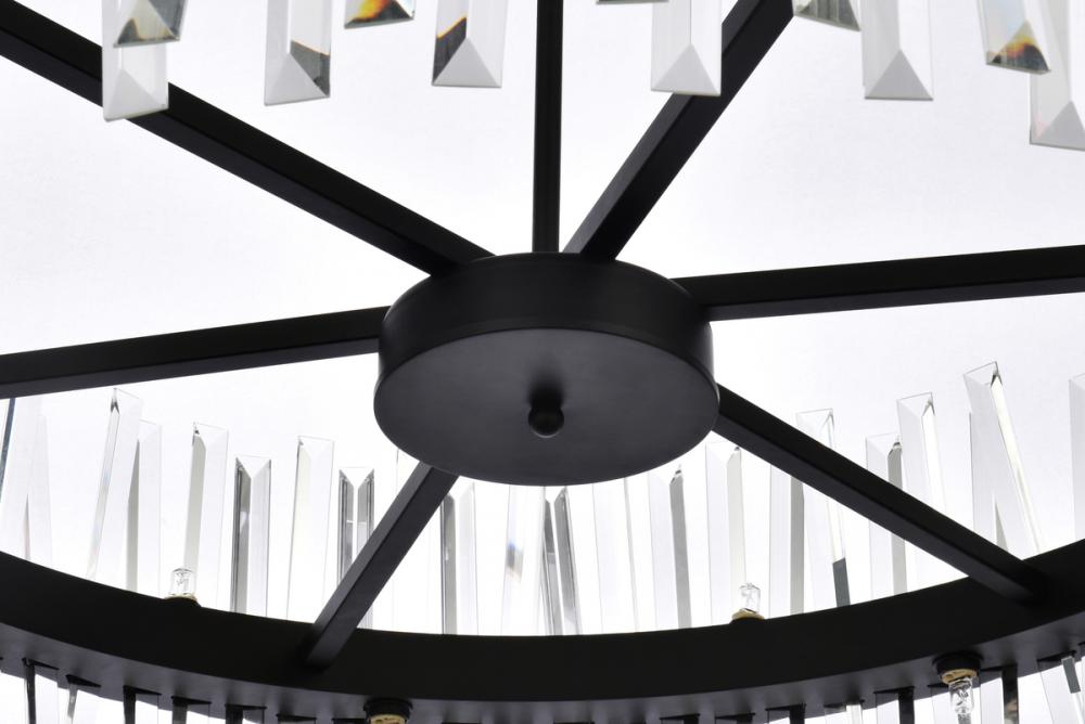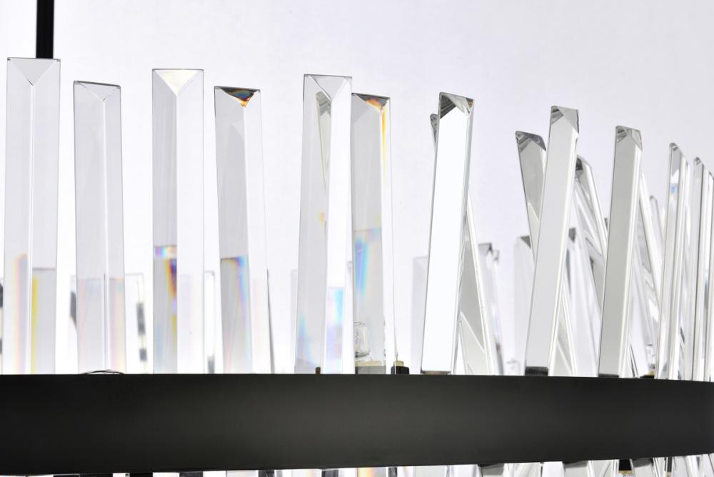 Modern crystal chandelier features top and bottom tier crystal prisms staggered along the wrought iron frame. The thick metal frame wraps around top grade crystal prisms ensure it is built to last, definitely worth it. Hang this work of art and dim the lights for a bit of sophisticated lighting in your home. Get lost in a beautiful light and sleek design available in multiple finishes. The hanging rod conveniently comes with a slope ceiling adapter, perfect for your vaulted or angled ceiling.