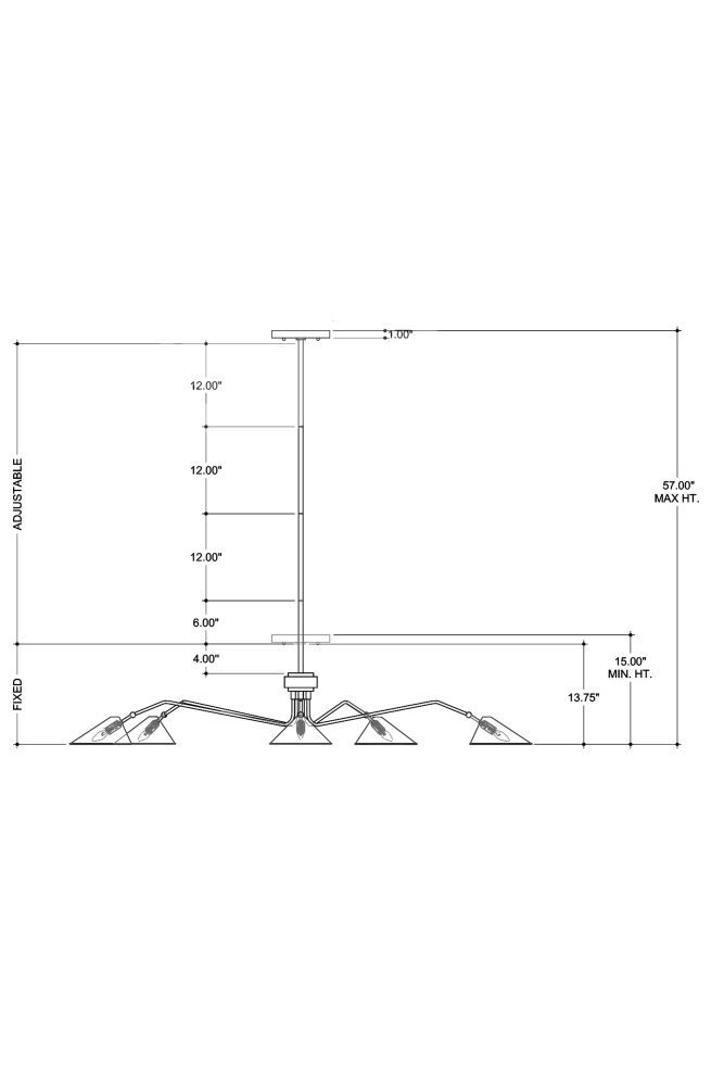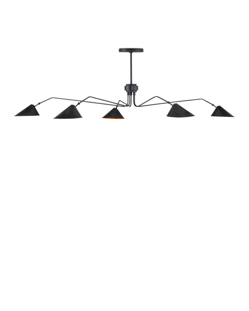 The Serpa Black Chandelier has a lightly weathered feel thanks to the rubbed French black finish on the slender arms and shades. Made of wrought iron, the spidery fixture has a vintage feel with mid-century modern lines. The shades have gold leaf interiors, which warms the illumination coming from this black chandelier with an industrial feel. Adjustable from 15" to 57" with use of included chain/rod kit/cable. If your space calls for a longer drop, additional chain/rods/cable is available for purchase.
