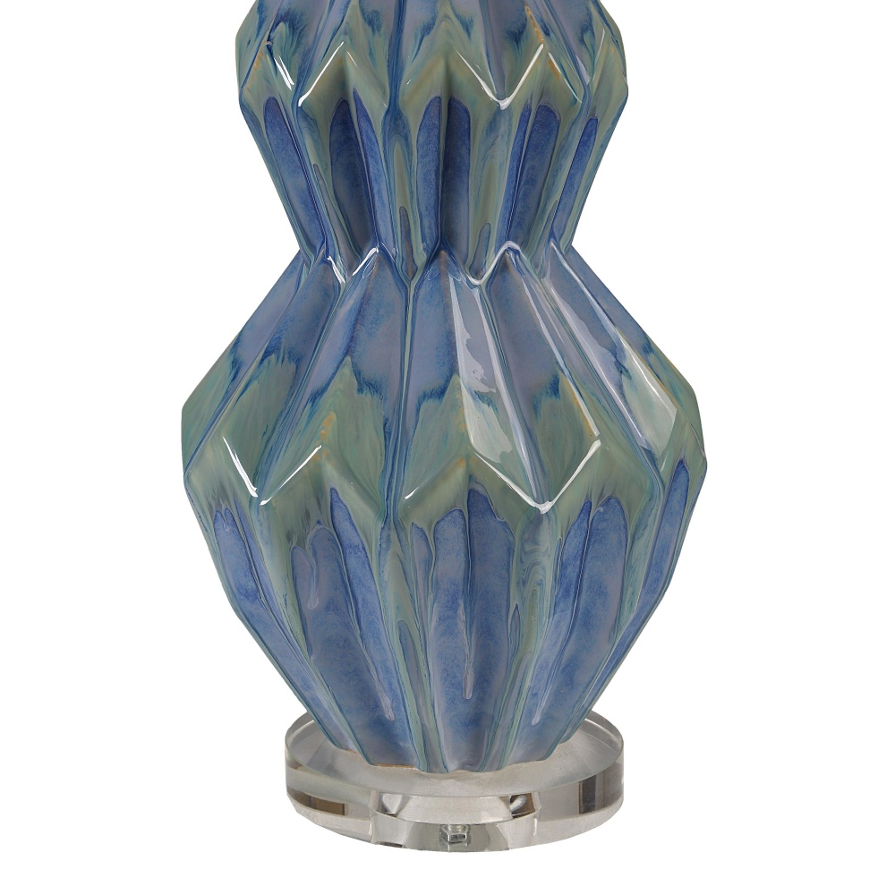 Every room should have something beautiful that catches the eye and the Serres lamp meets that need and more. Curvaceous lines and a stunning turquoise blue glaze grace its body while a crystal-clear base and chrome-plated accents add a dash of sparkle. A clean off-white linen shade diffuses light through the space to illuminate and cast a welcoming glow in any room.