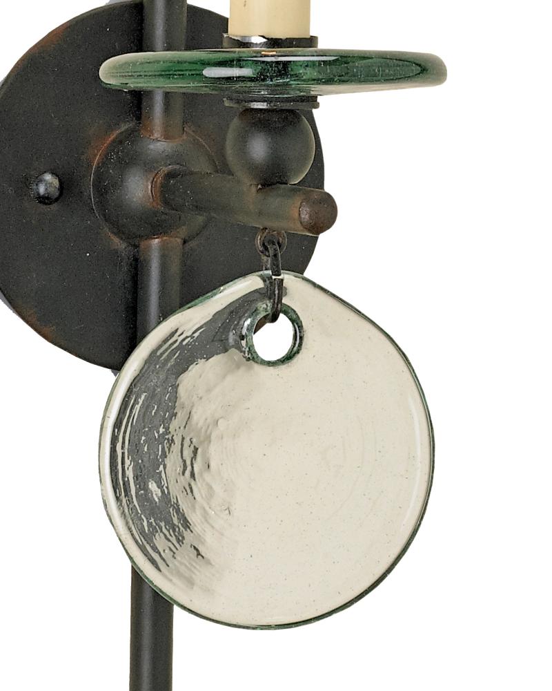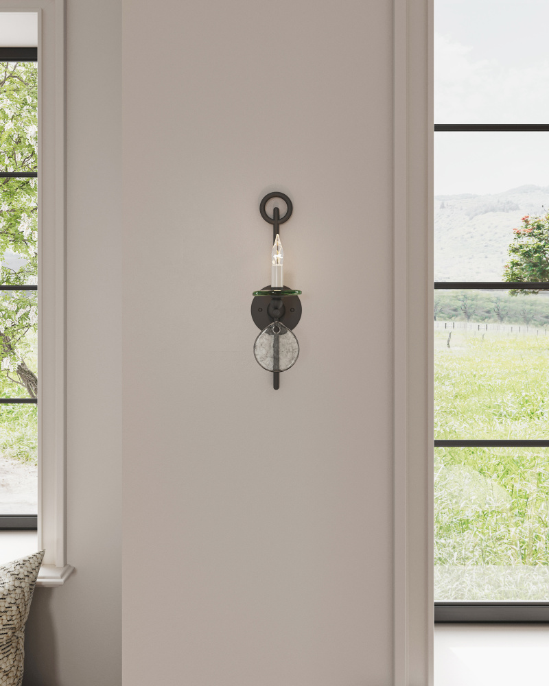 The Sethos Black Wall Sconce has a keyhole that dangles a recycled glass disc. The linear wrought iron frame in an old iron finish references early American antiques to bring the black sconce a nostalgic profile.