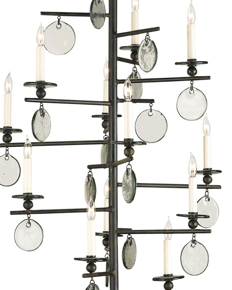 This is a very tall version of the Sethos Chandelier with its recycled glass discs and wrought iron framework that will look commanding in tall narrow spaces. The linear wrought iron frame has been treated to an old iron finish to give the design heft, while the discs of recycled glass dangling from the arms of the 12-light fixture glint when light pierces them. The unusual appearance of this chandelier will appeal to those who have grown weary of the ubiquitous candelabra.