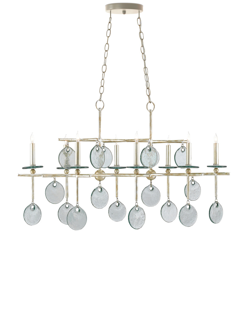 The Sethos Silver Rectangular Chandelier has a linear wrought iron frame in a silver Granello finish that refences early American antiques. This and the discs of recycled glass dangling from its arms bring the silver chandelier a nostalgic feel. Adjustable from 28" to 97" with use of included chain/rod kit/cable. If your space calls for a longer drop, additional chain/rods/cable is available for purchase.